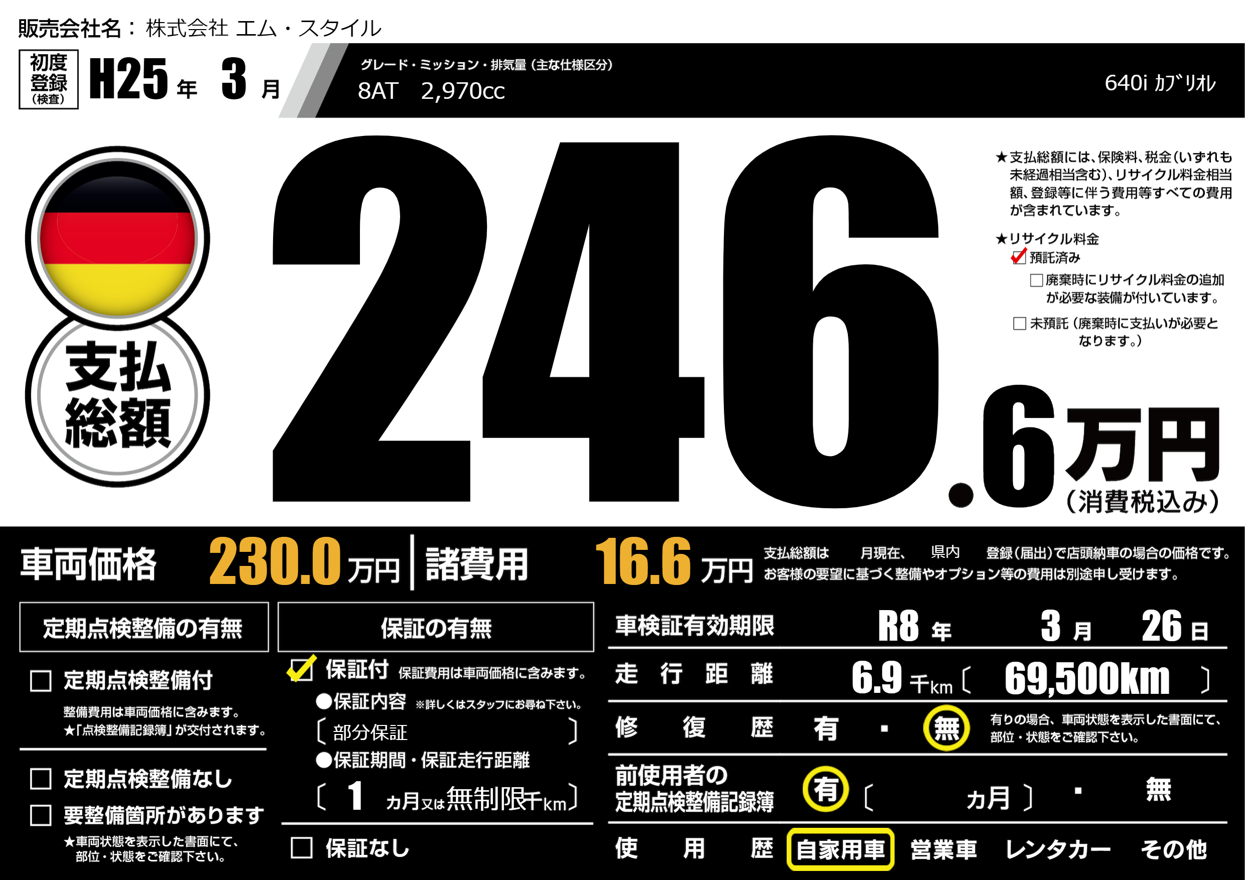 | 車名 | 640i カブリオレ | グレード ミッション 排気量 |