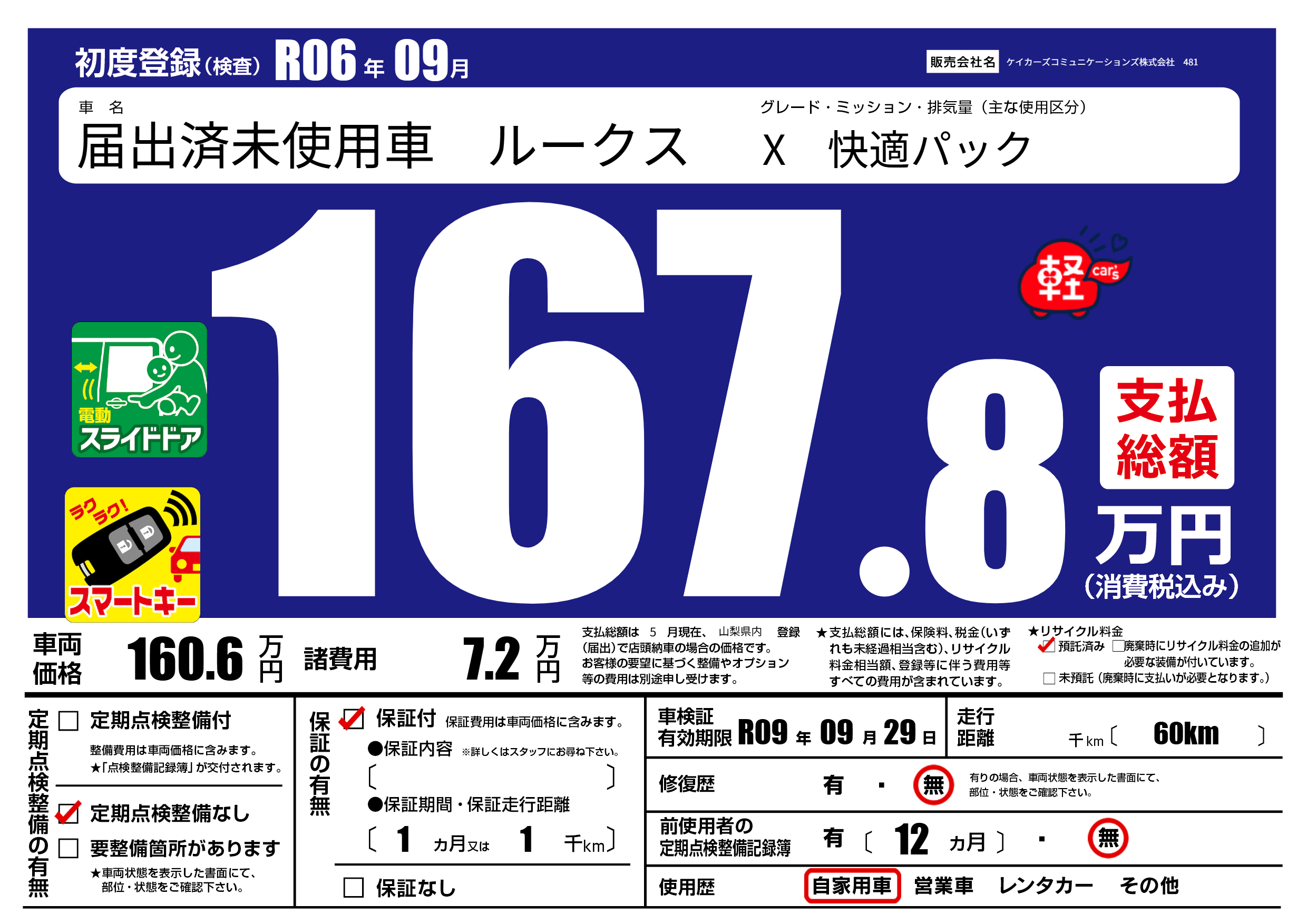 | 走行キロ | - | 初年度登録 | R06年09月 |