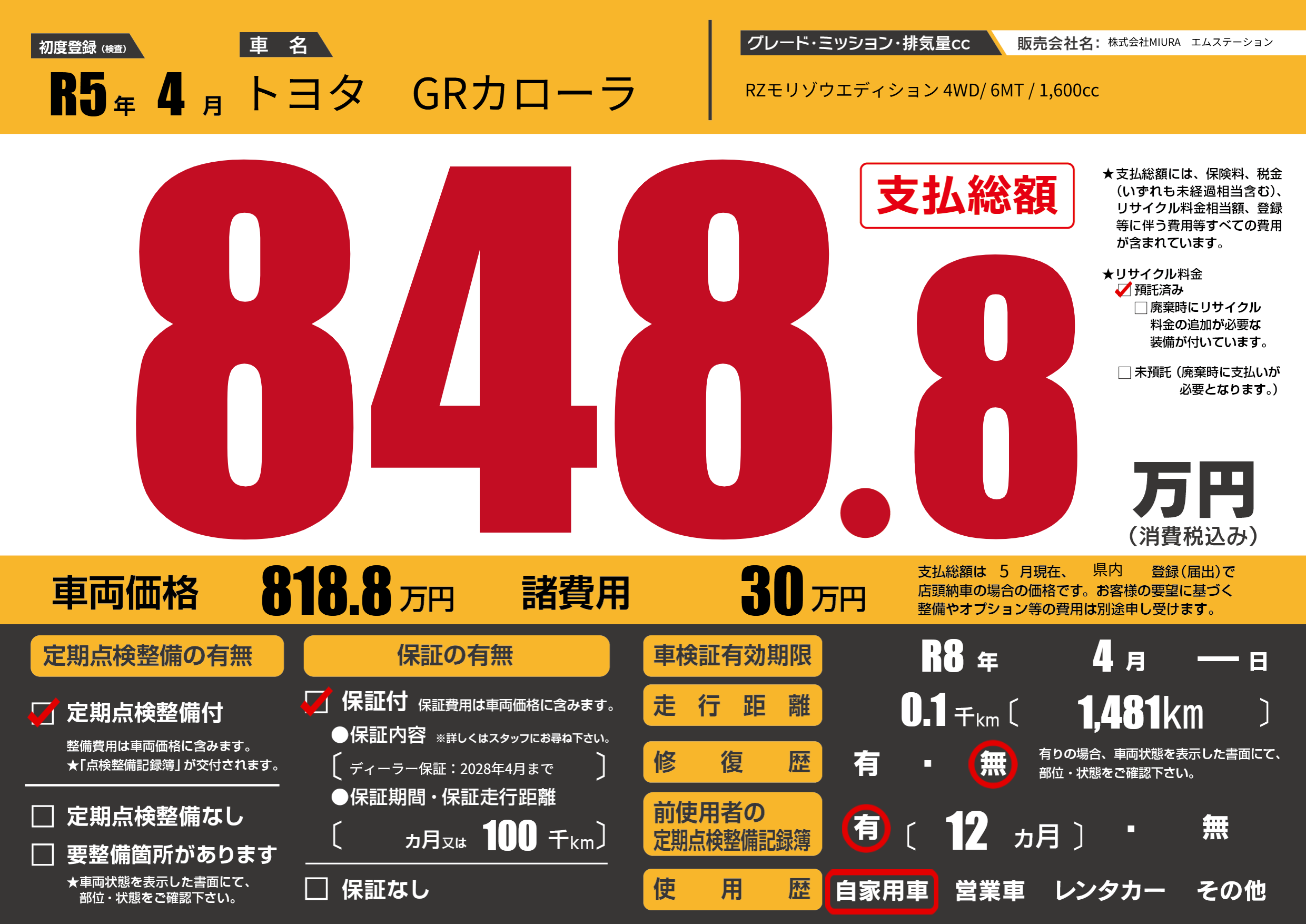 | 車名 | トヨタ GRカローラ | グレード ミッション 排気量 |