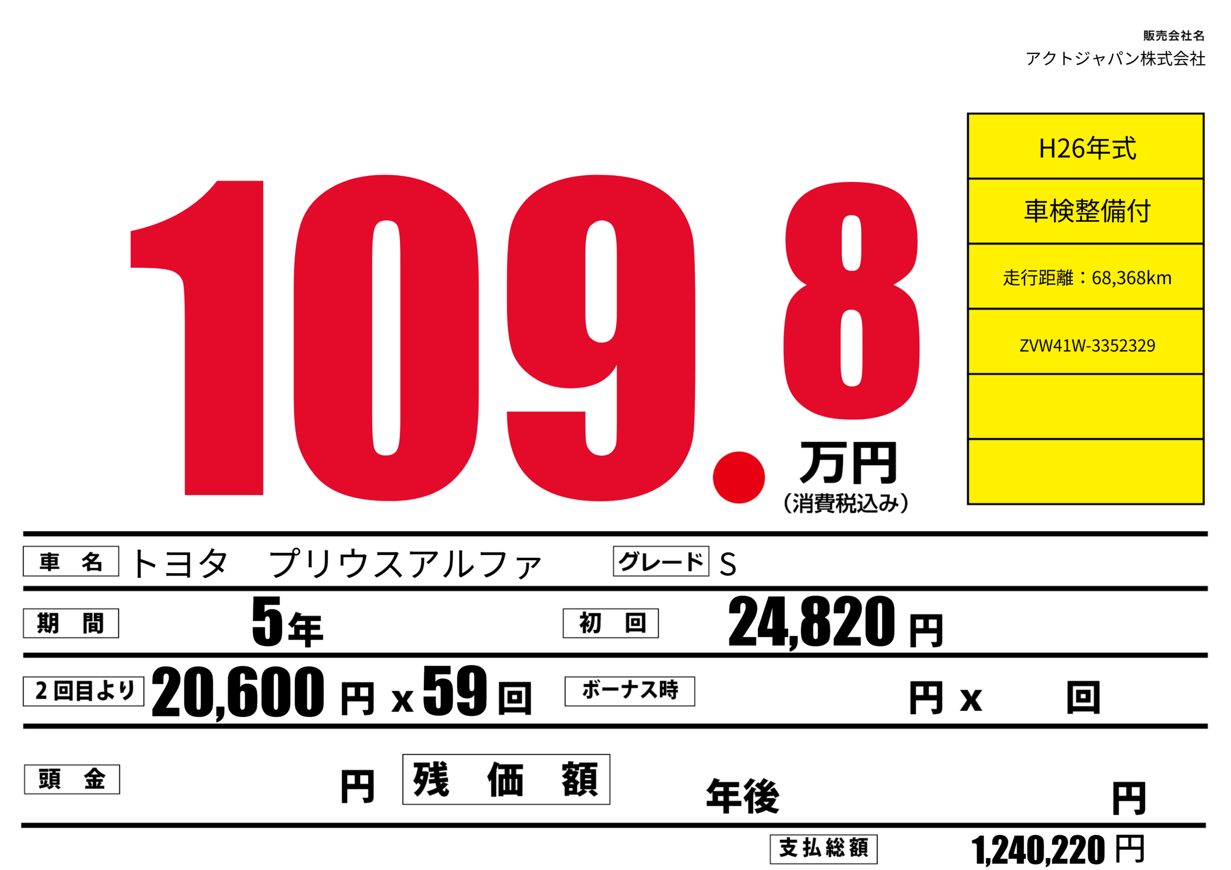 | 車名 | トヨタ プリウスアルファ | グレード ミッション 排気量 |