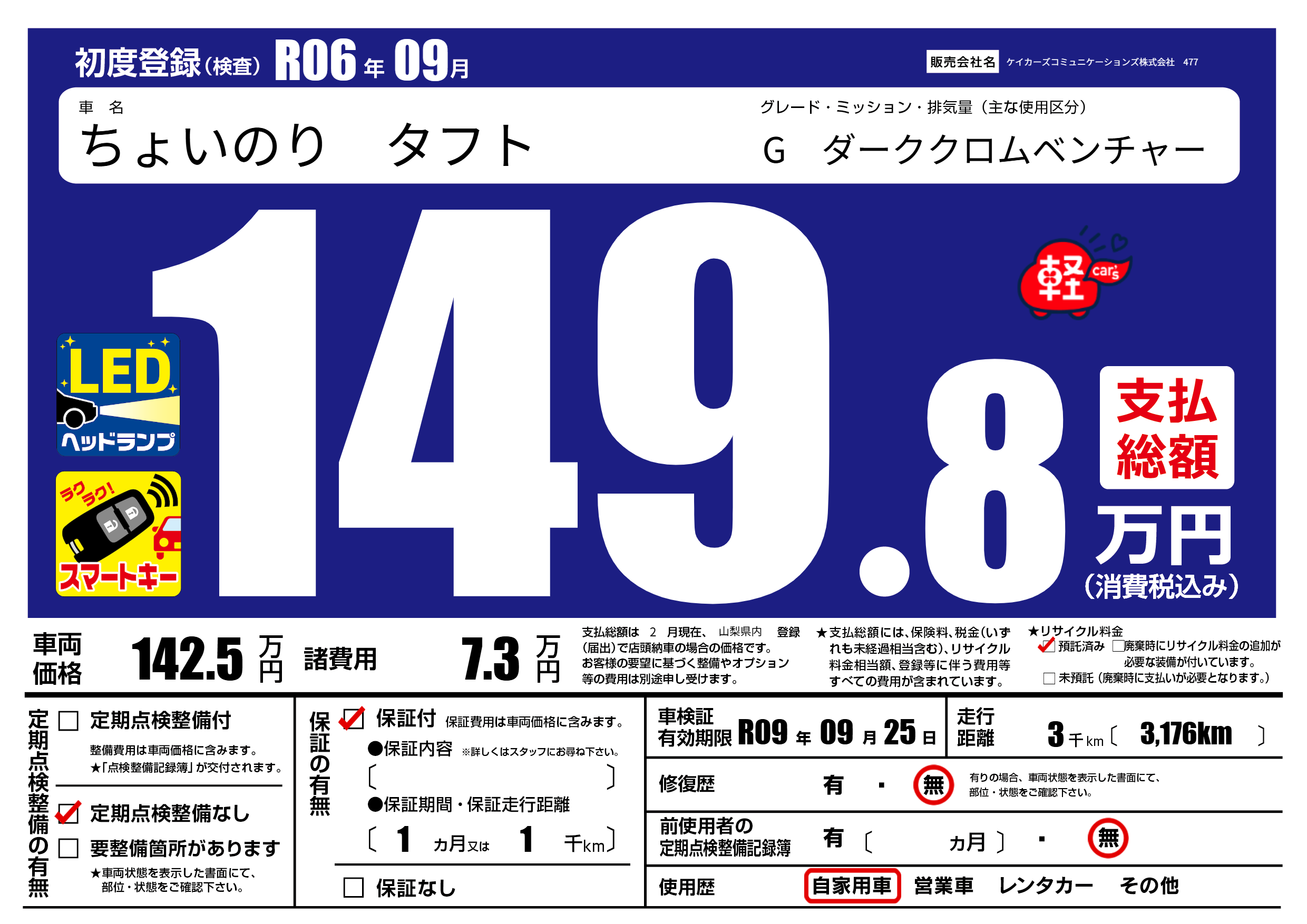 | 走行キロ | 0.3万km | 初年度登録 | R06年09月 |