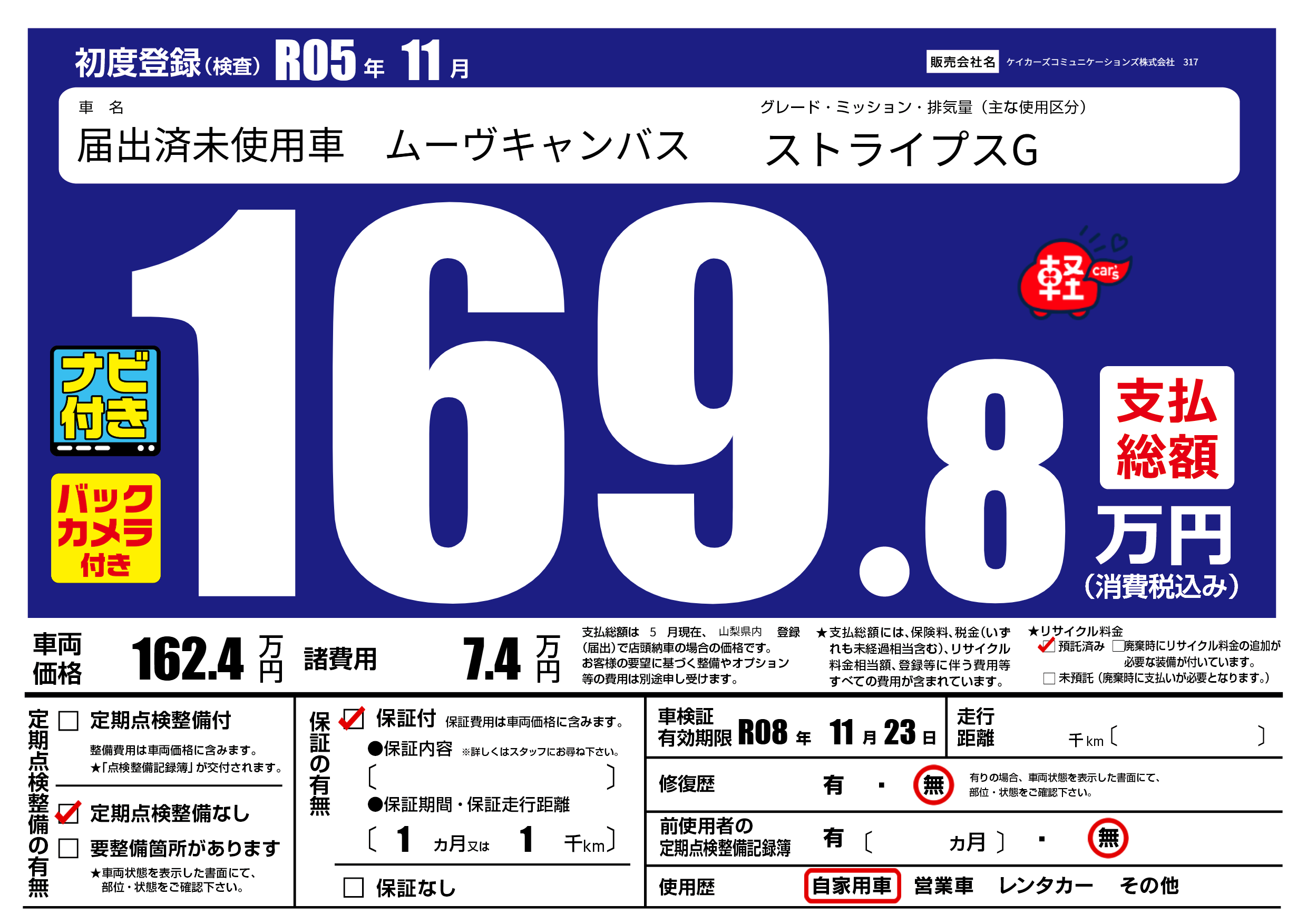 | 走行キロ | - | 初年度登録 | R05年11月 |