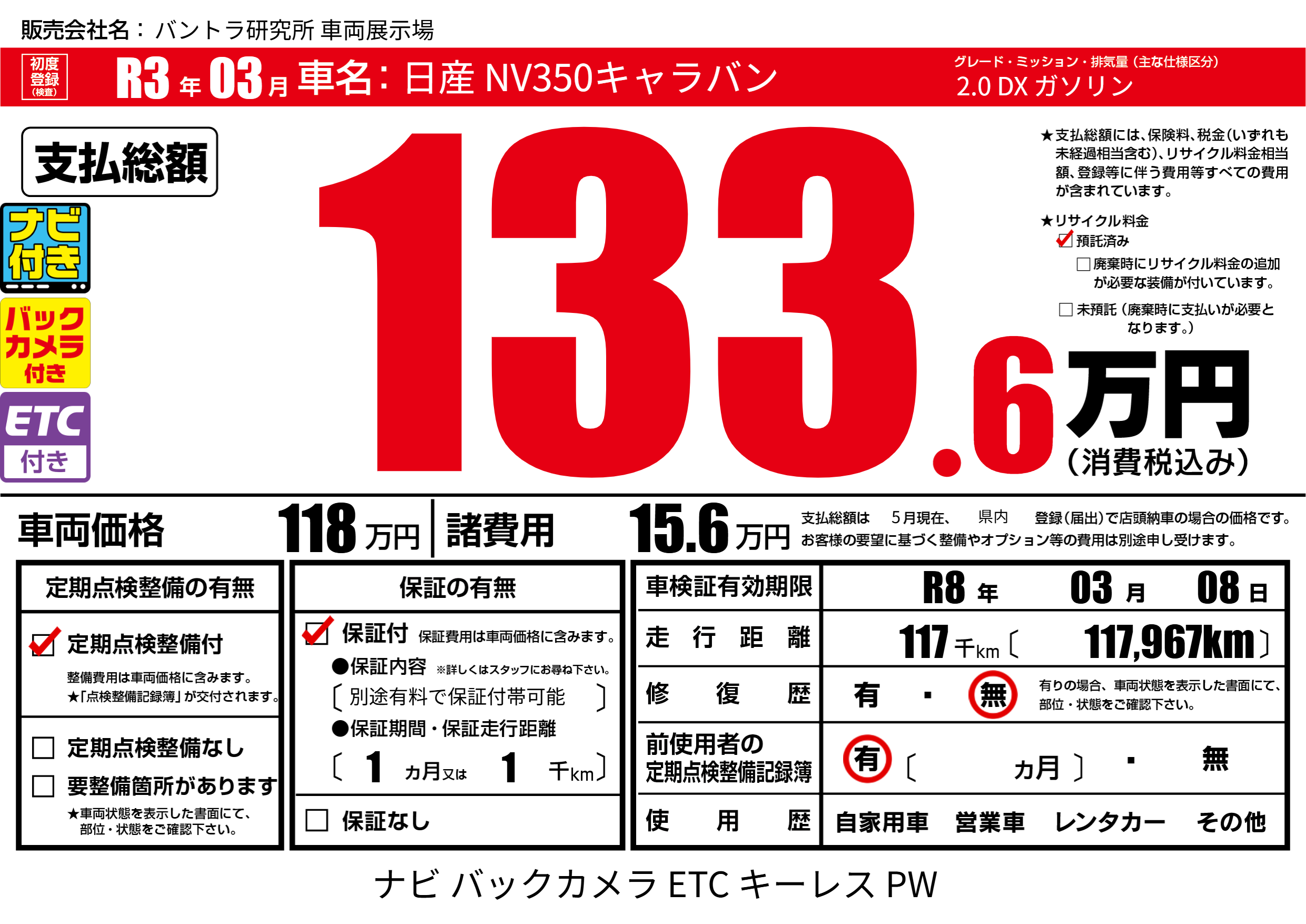 | 車名 | 日産 NV350キャラバン | グレード ミッション 排気量 |