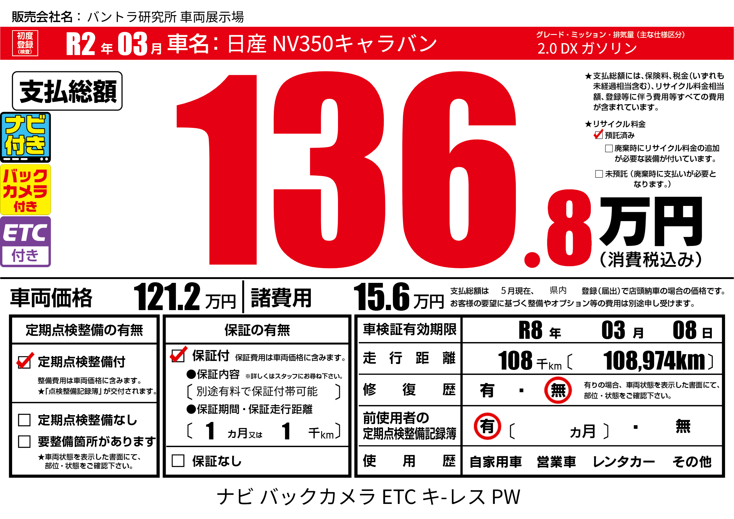 | 車名 | 日産 NV350キャラバン | グレード ミッション 排気量 |