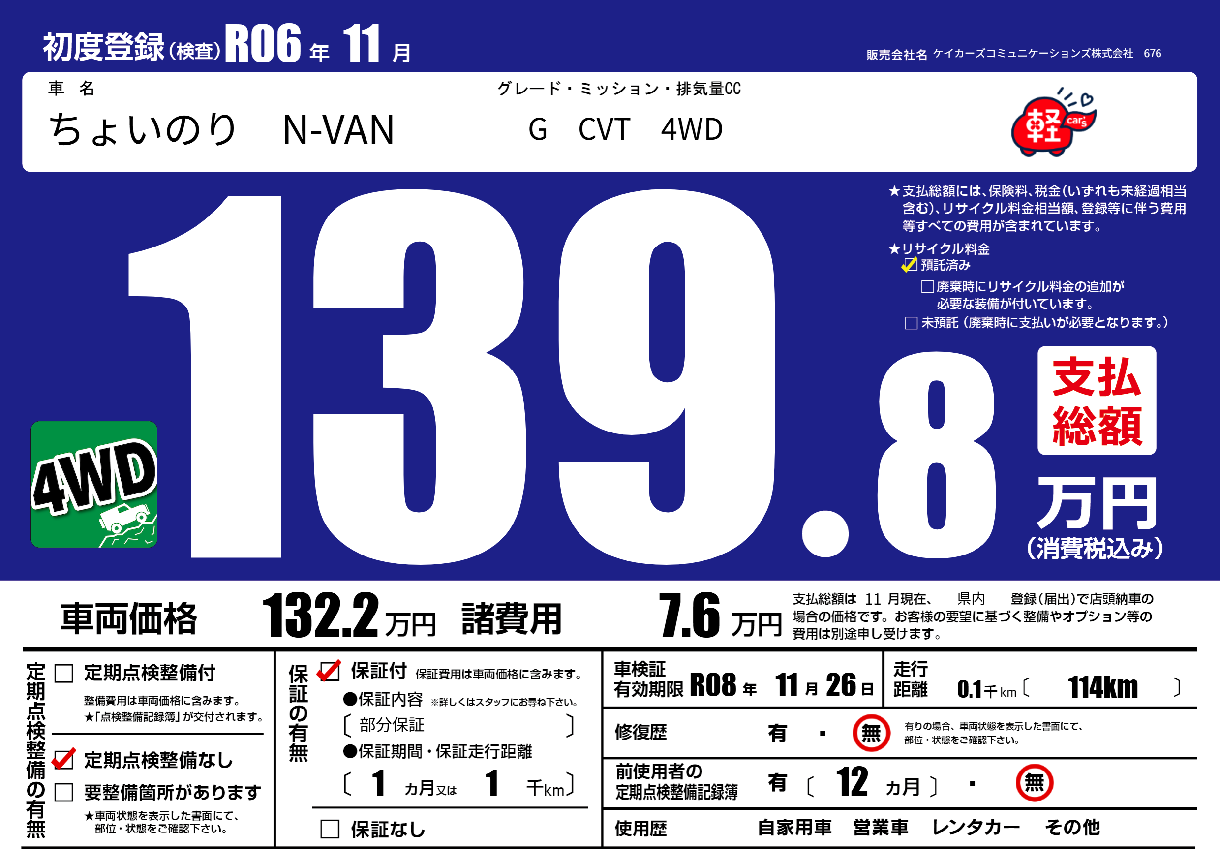 | 走行キロ | - | 初年度登録 | R06年11月 |