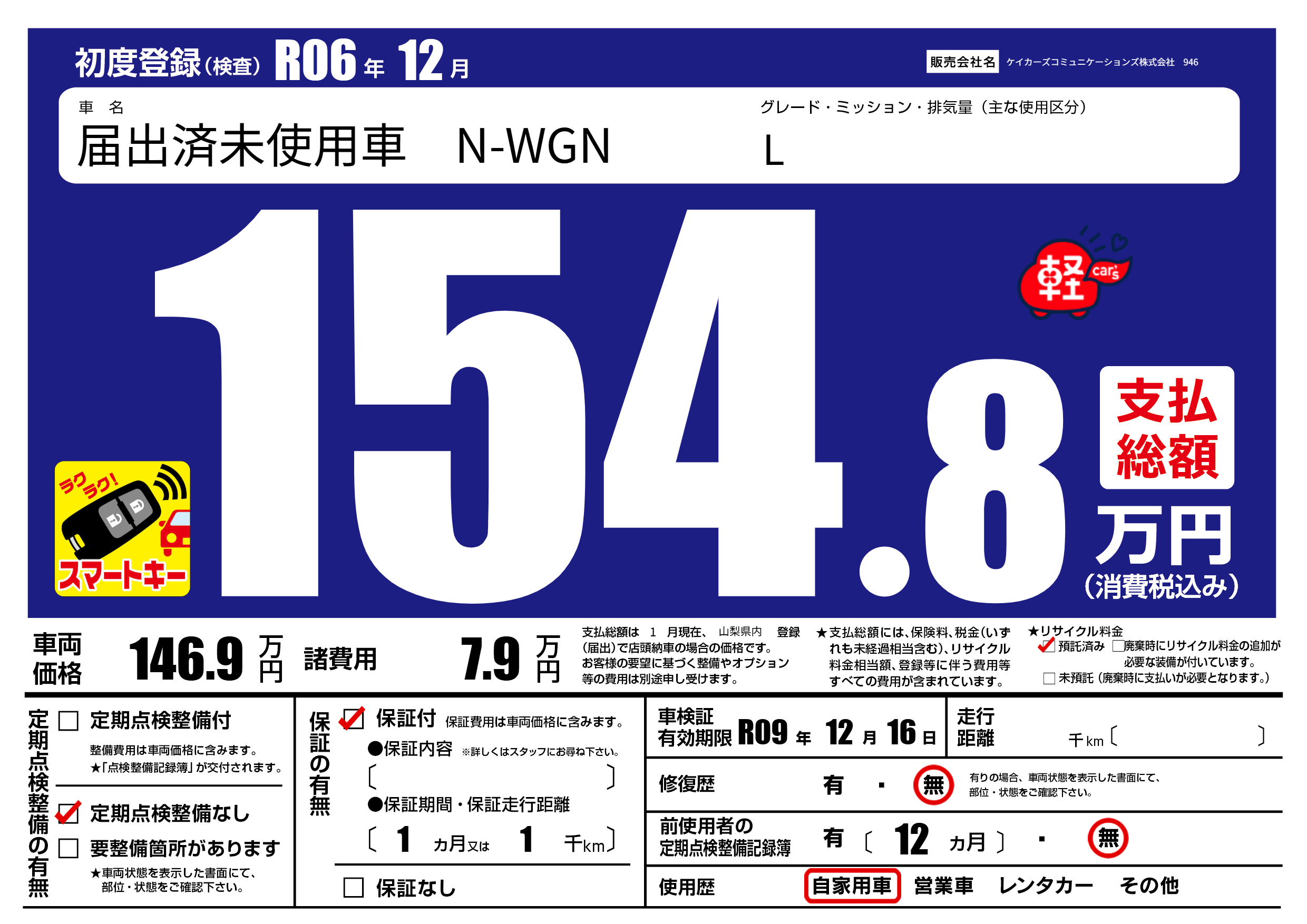 | 走行キロ | - | 初年度登録 | R06年12月 |