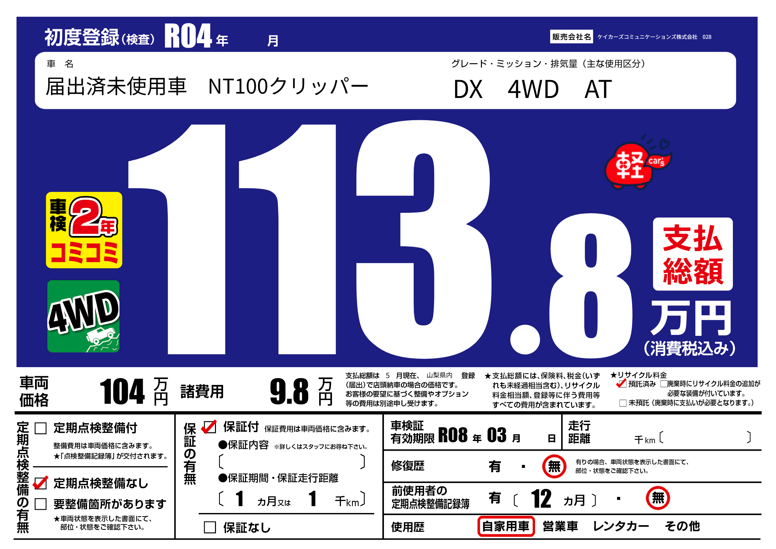 | 車名 | 届出済未使用車 NT100クリッパー | グレード ミッション 排気量 |