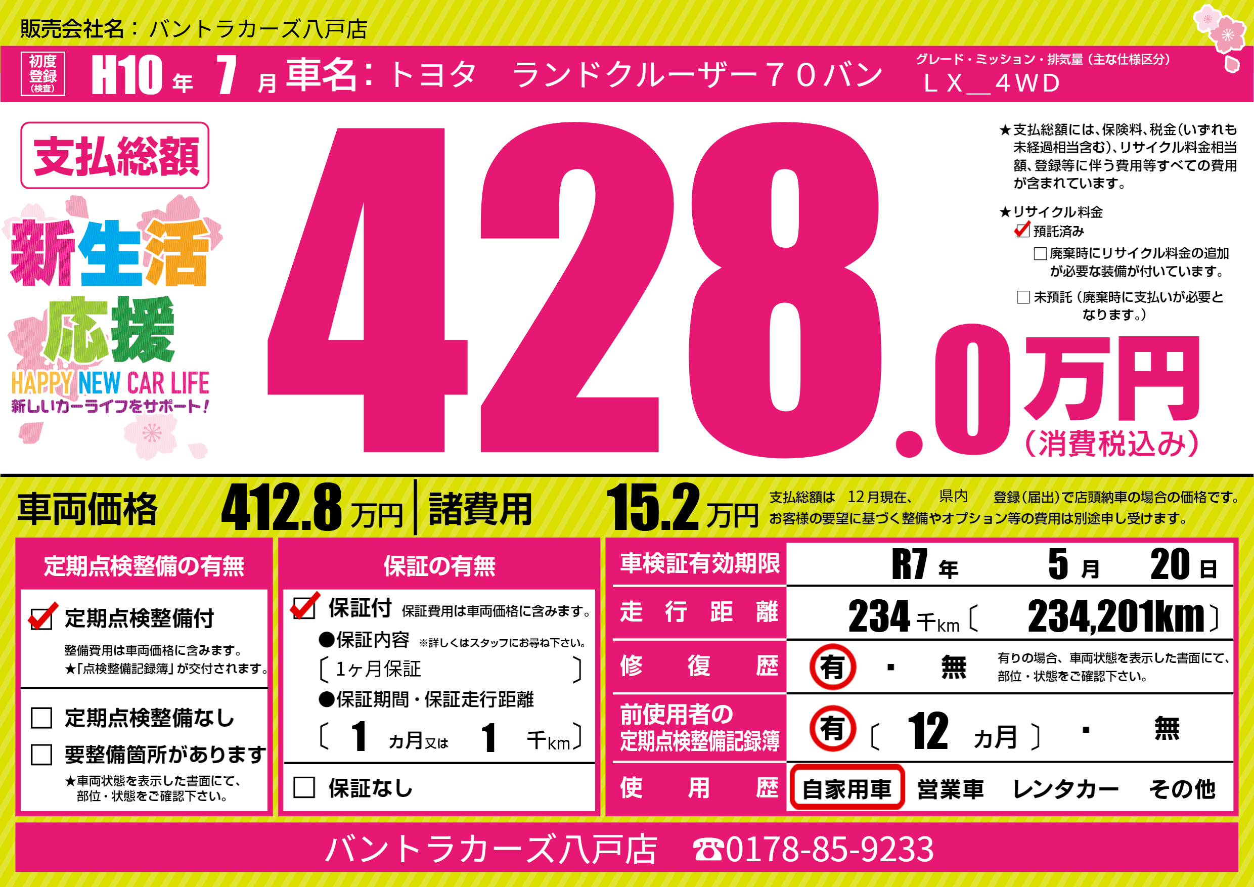 | 車名 | トヨタ ランドクルーザー70バン | グレード ミッション 排気量 |