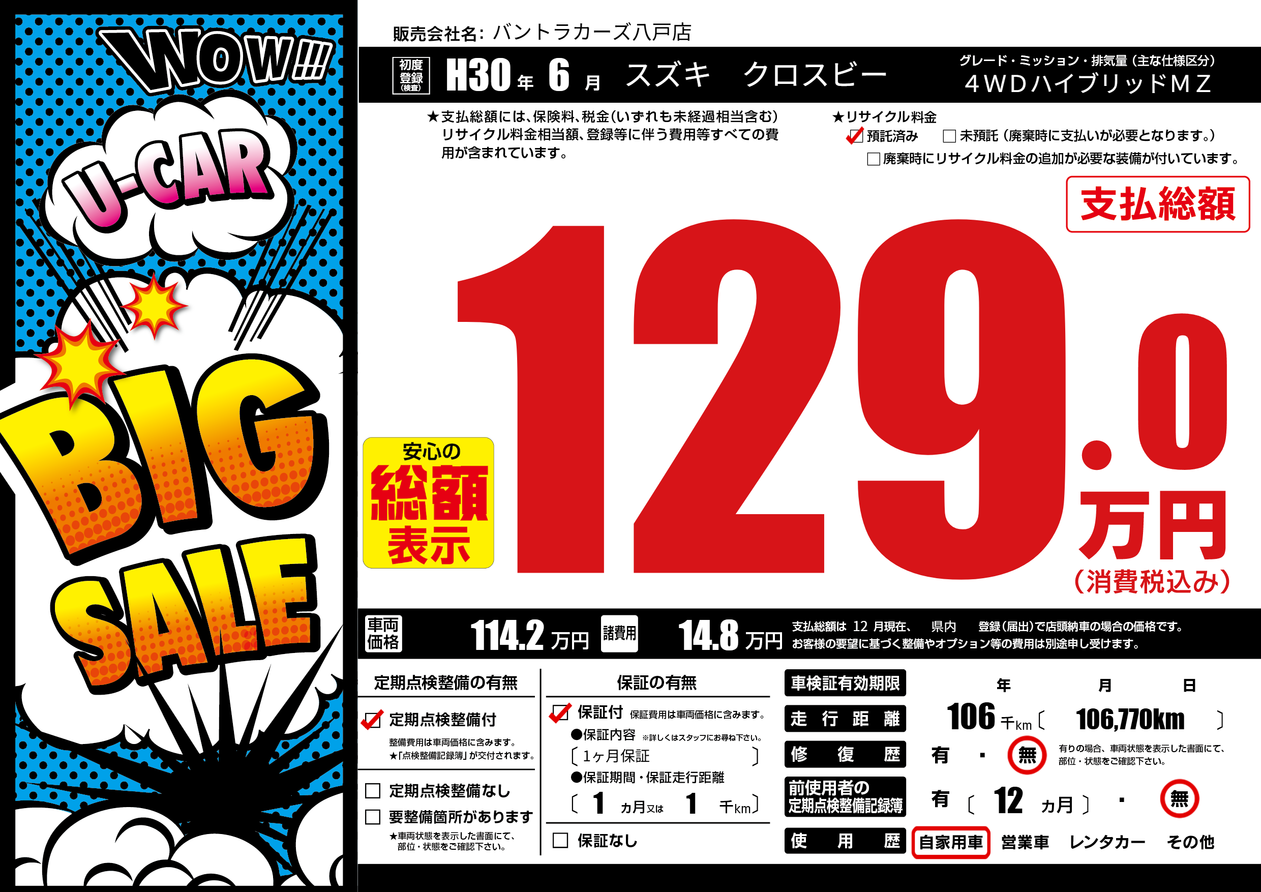 | 走行キロ | 10.6万km | 初年度登録 | H30年6月 |