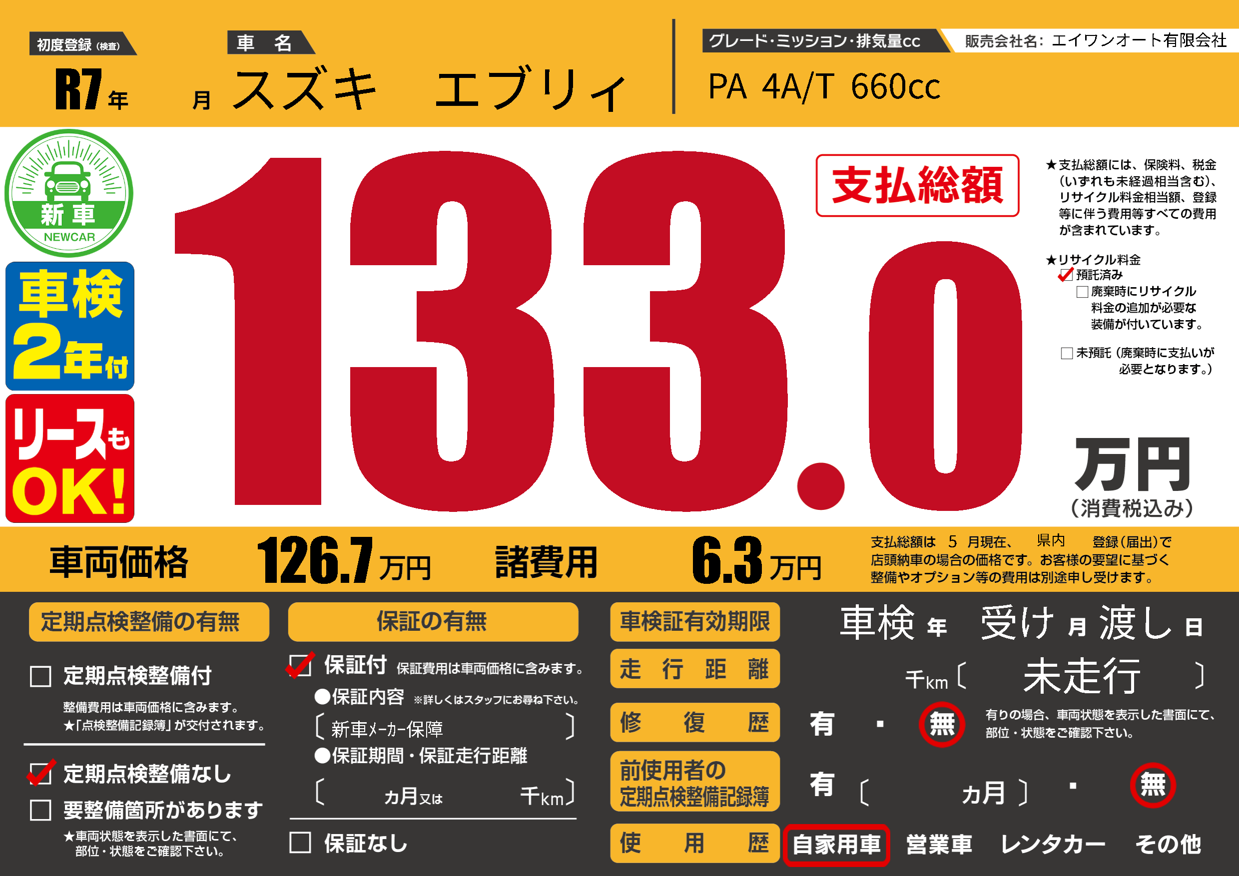 | 車名 | スズキ エブリィ | グレード ミッション 排気量 |