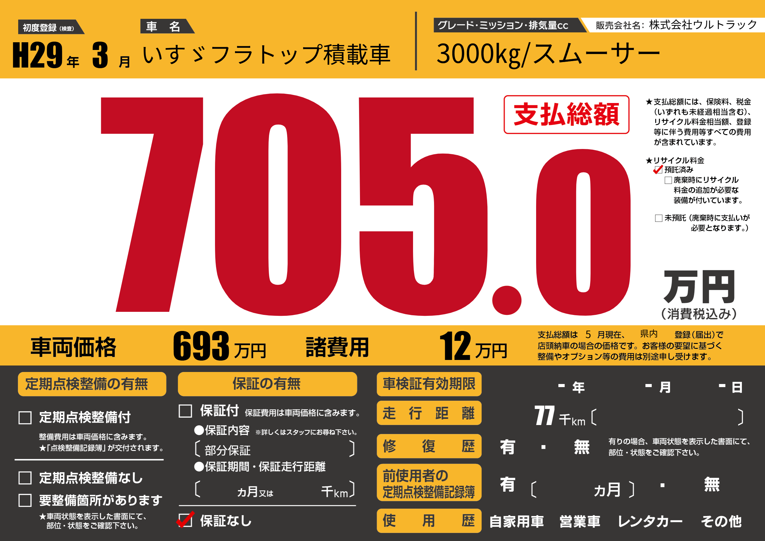 | 車名 | いすゞフラトップ積載車 | グレード ミッション 排気量 |