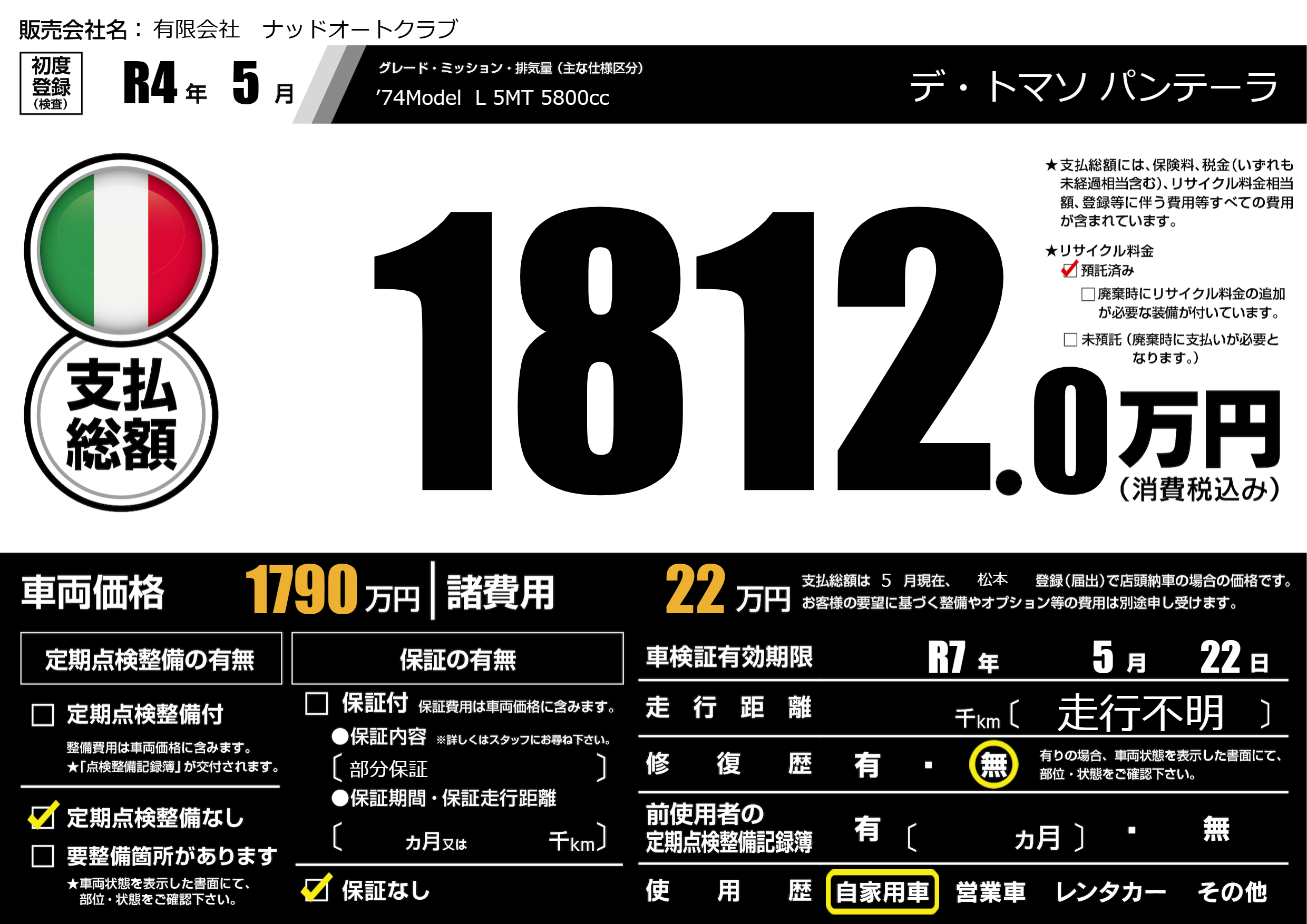 | 車名 | デ・トマソ パンテーラ | グレード ミッション 排気量 |