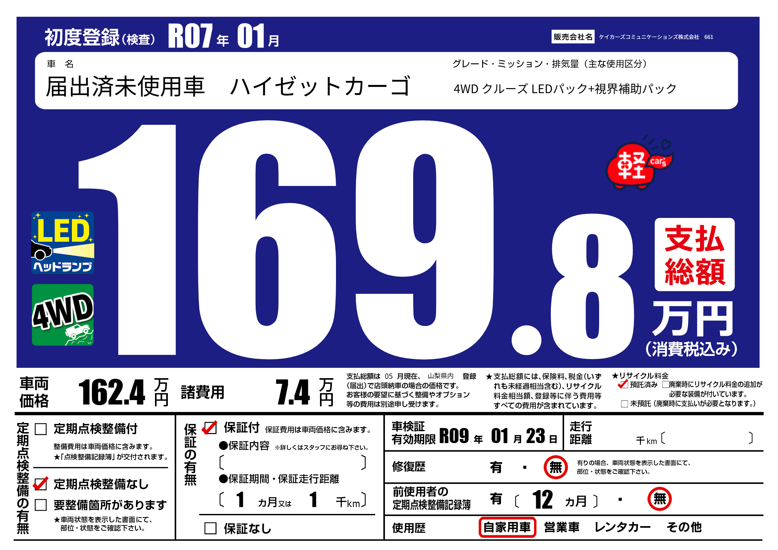 | 車名 | 届出済未使用車 ハイゼットカーゴ | グレード ミッション 排気量 |