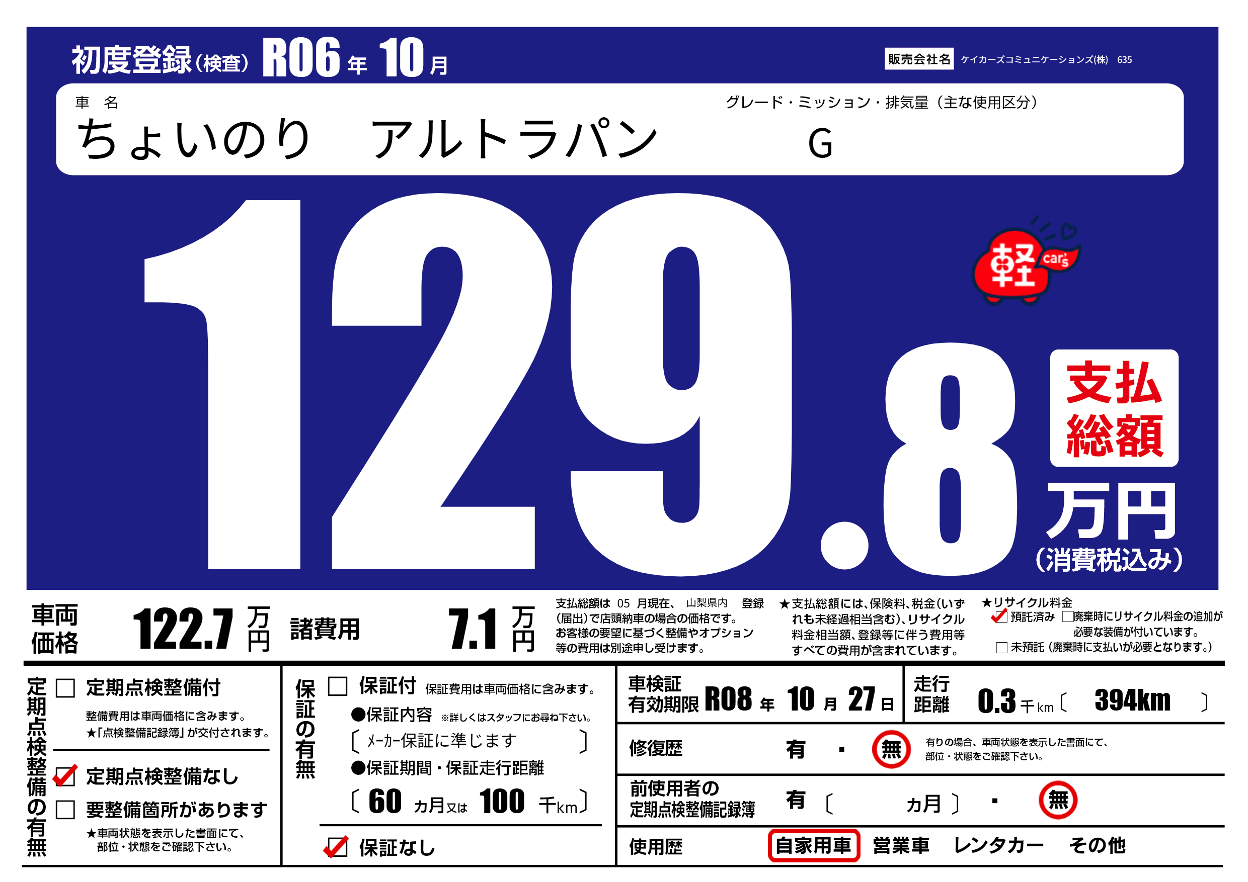 | 走行キロ | - | 初年度登録 | R06年10月 |