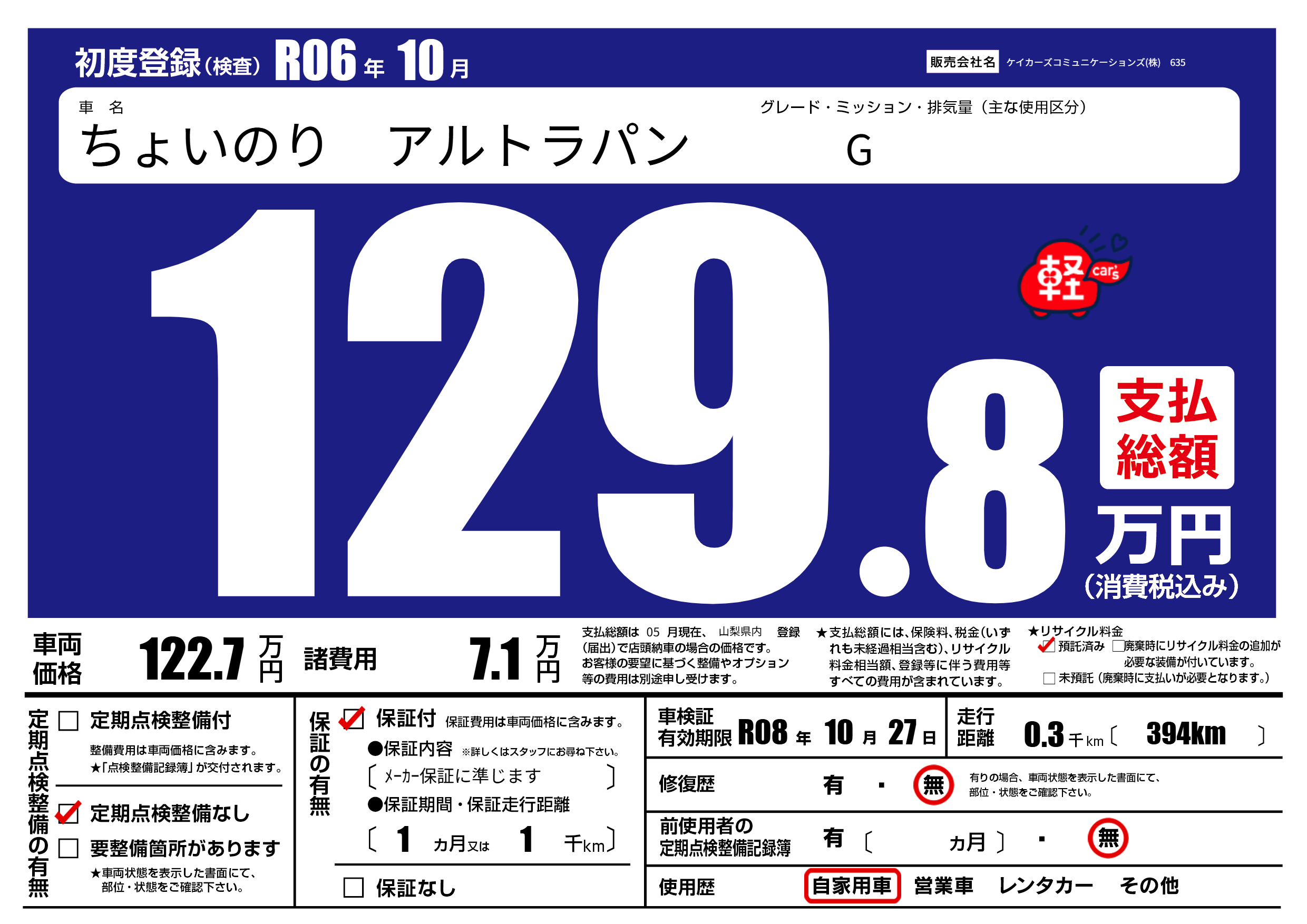 | 走行キロ | - | 初年度登録 | R06年10月 |