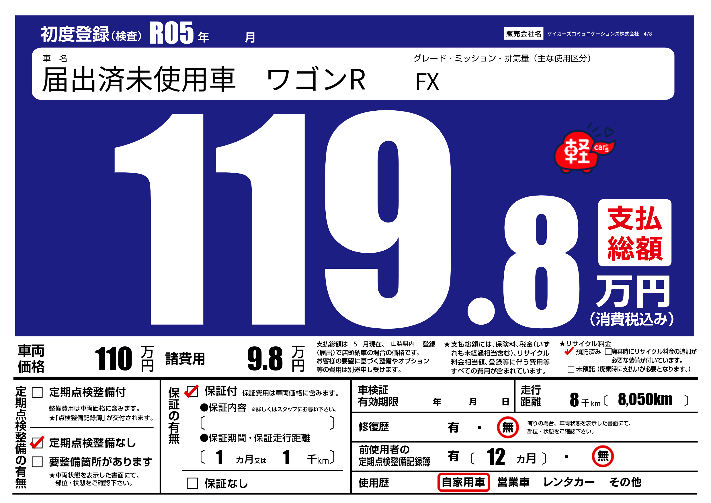 | 車名 | 届出済未使用車 ワゴンR | グレード ミッション 排気量 |