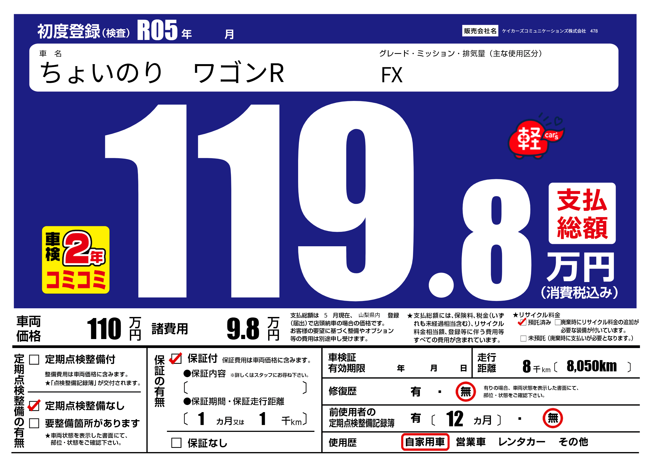 | 車名 | ちょいのり ワゴンR | グレード ミッション 排気量 |