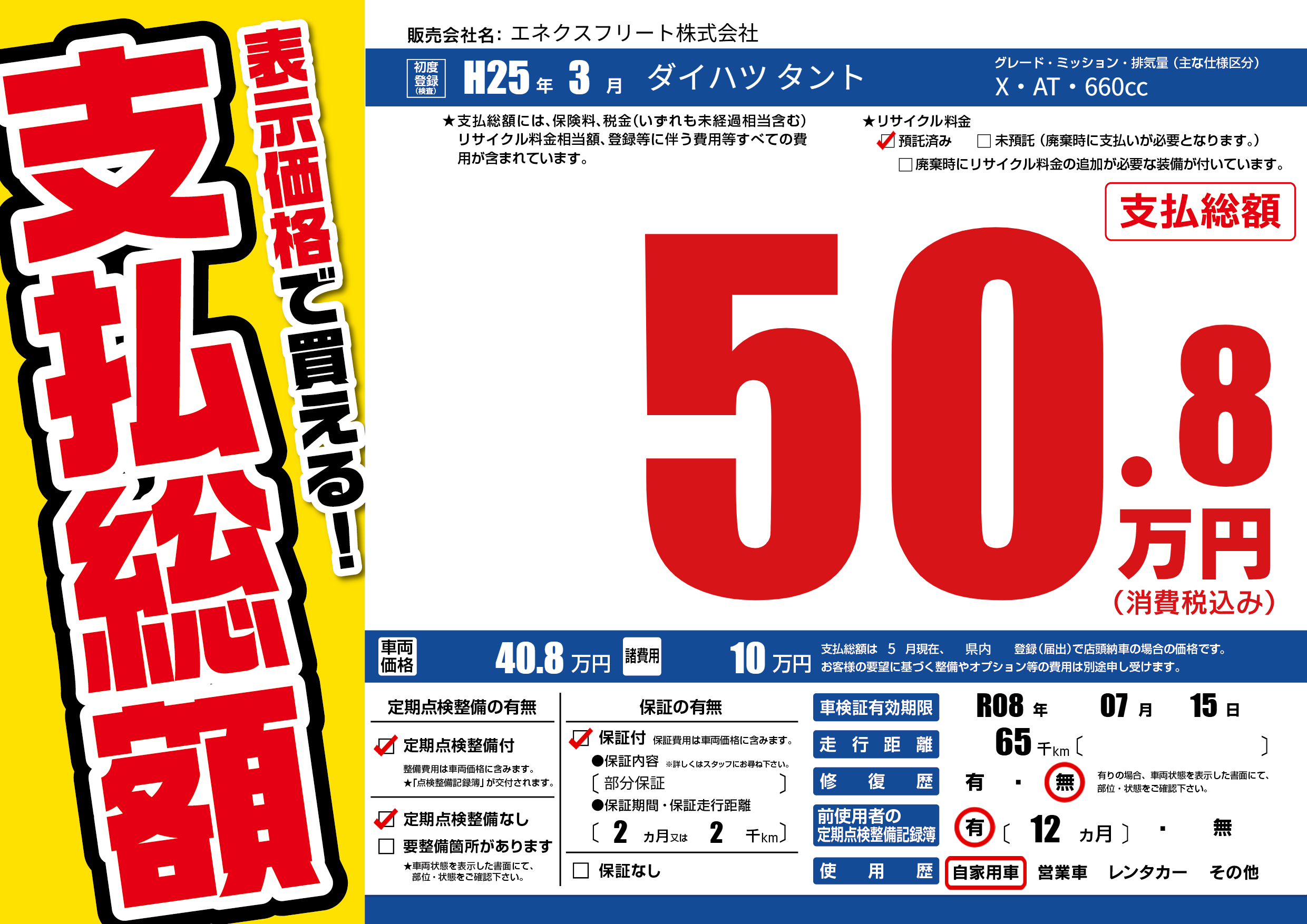 | 車名 | ダイハツ タント | グレード ミッション 排気量 |