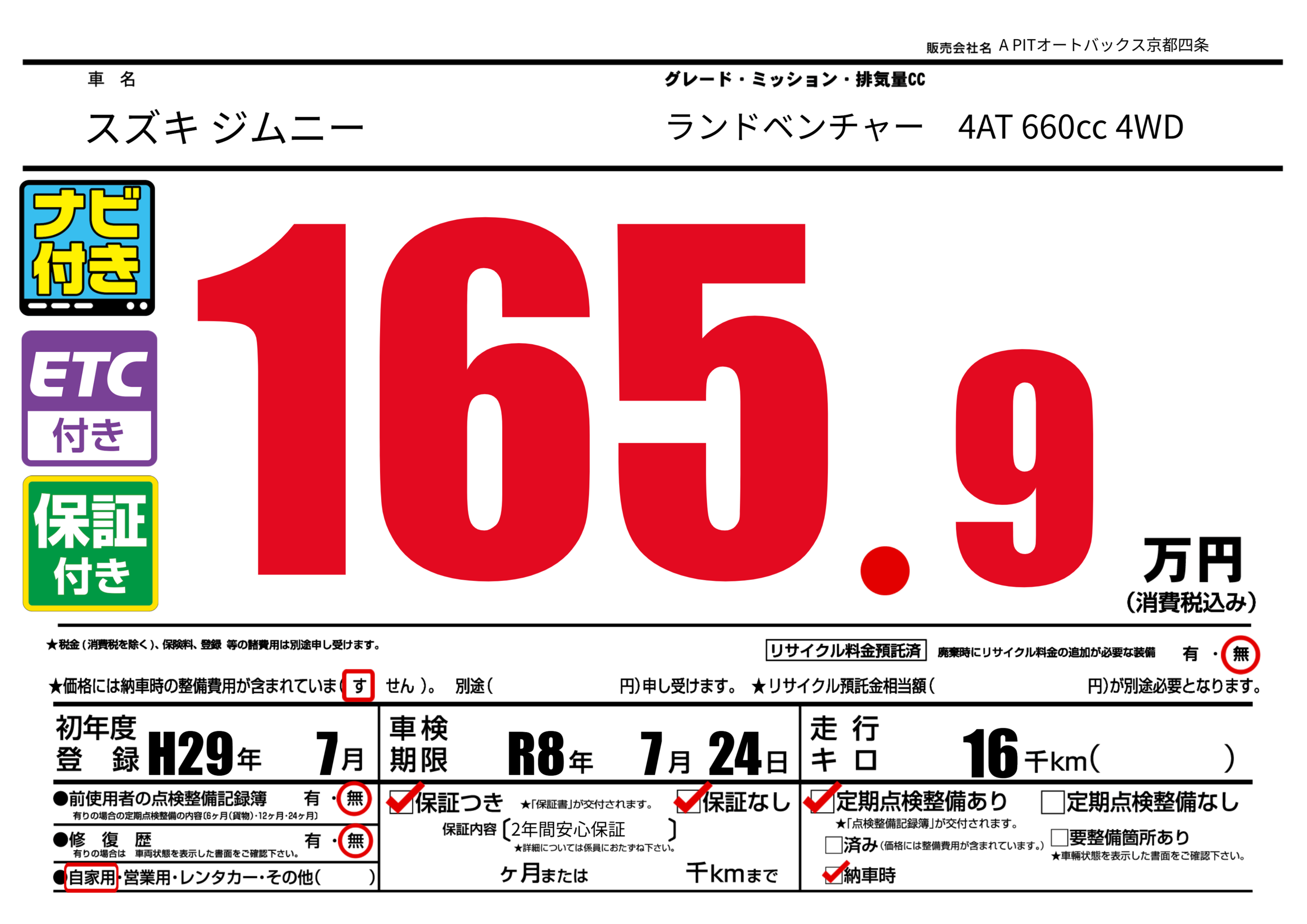 | 車名 | スズキ ジムニー | グレード ミッション 排気量 |