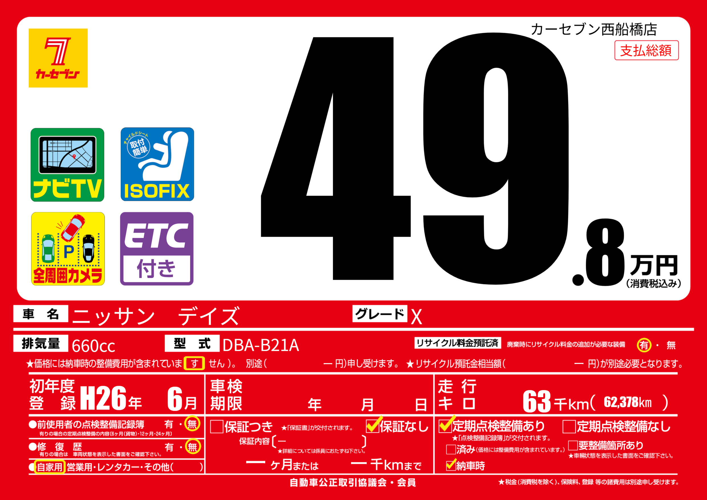 | 定期点検整備 | 定期点検整備あり 納車時あり | ||
