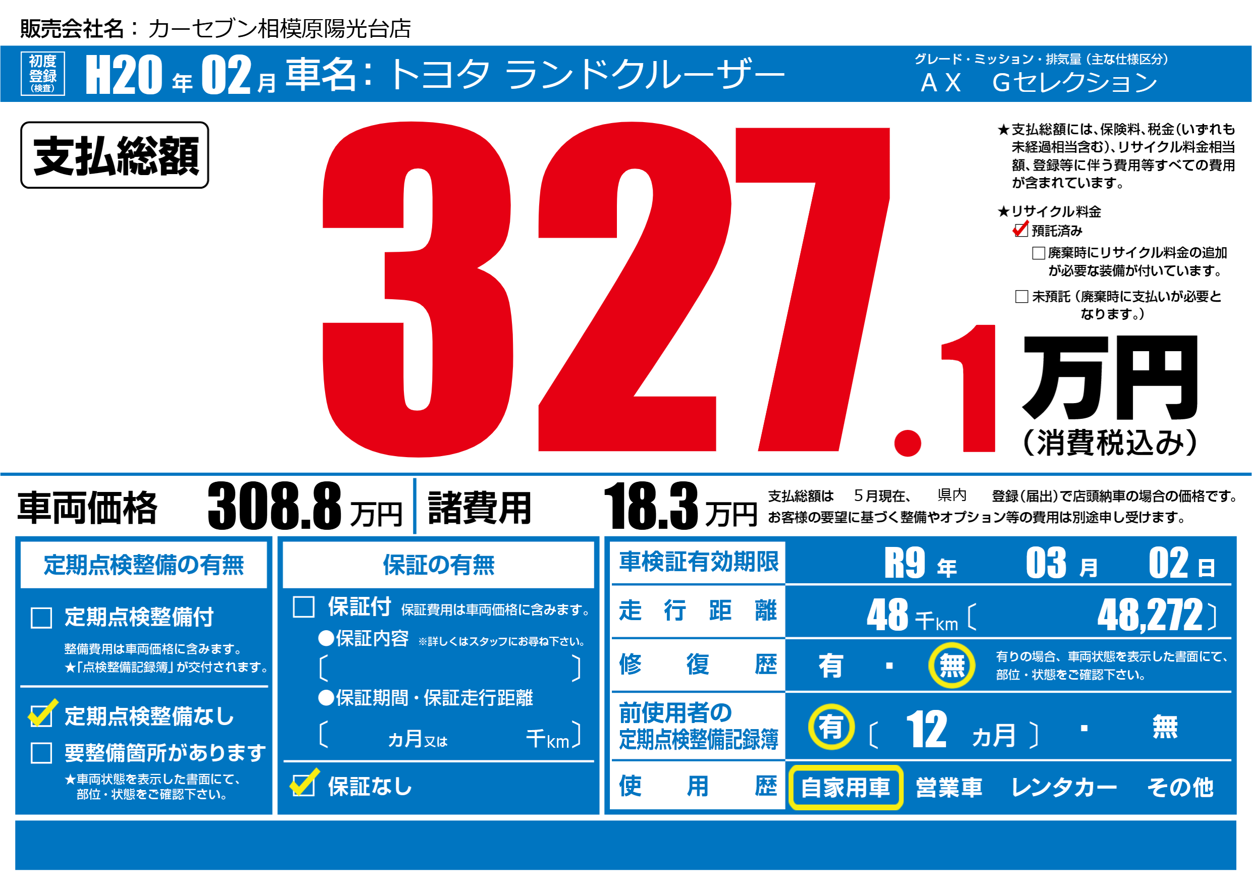 | 走行キロ | 4.8万km | 初年度登録 | H20年02月 |
