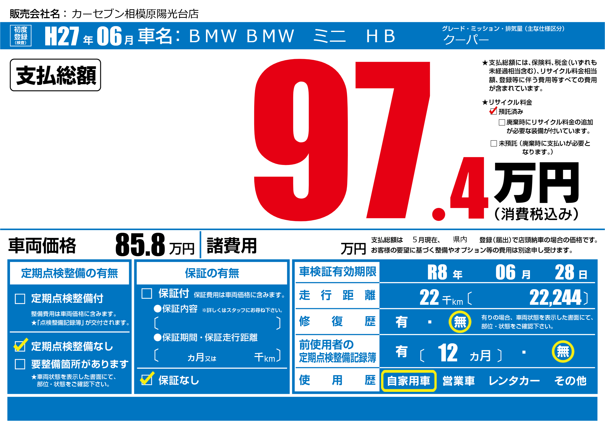 | 車名 | BMW BMW ミニ HB | グレード ミッション 排気量 |