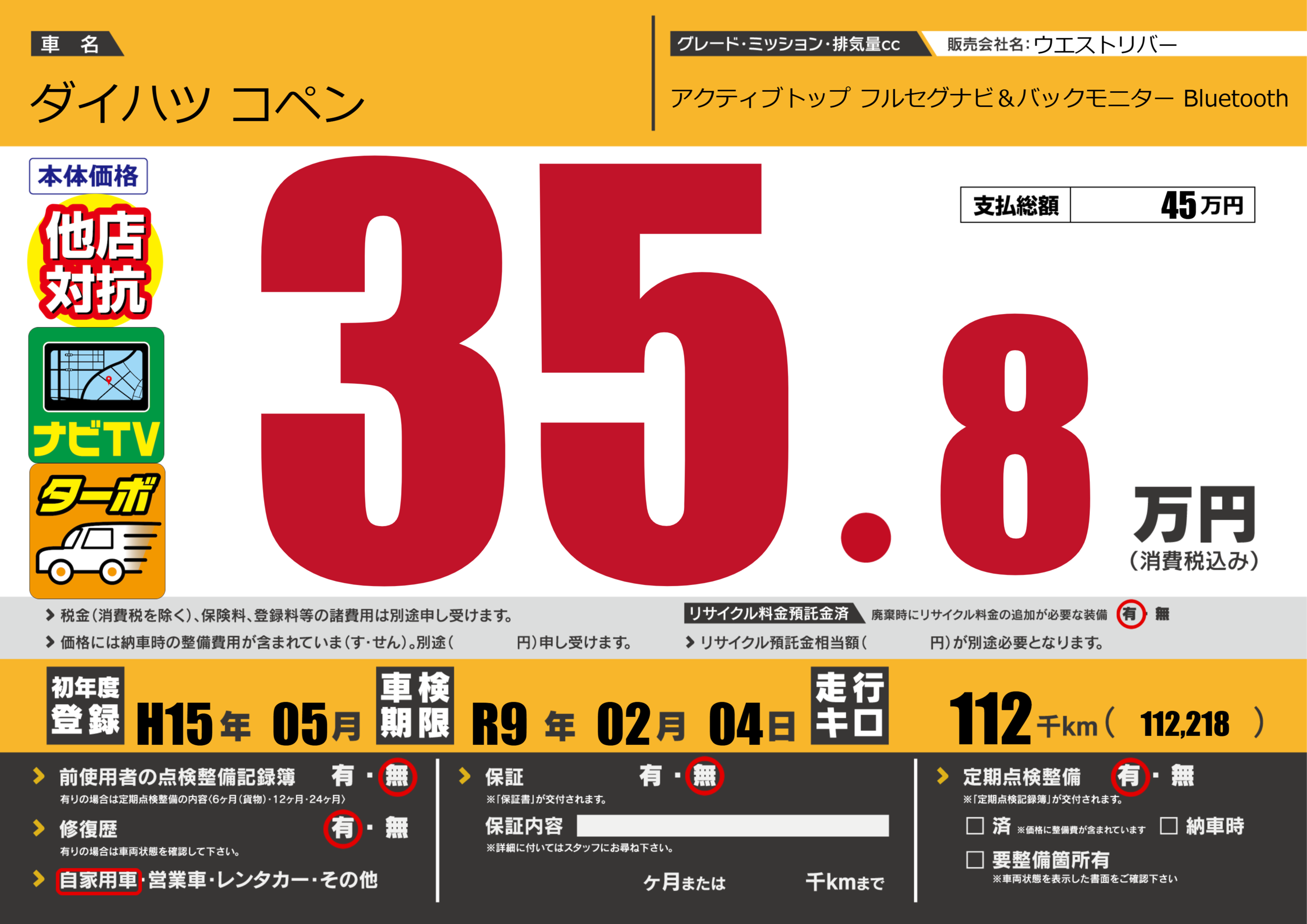 | 車名 | ダイハツ コペン | グレード ミッション 排気量 |