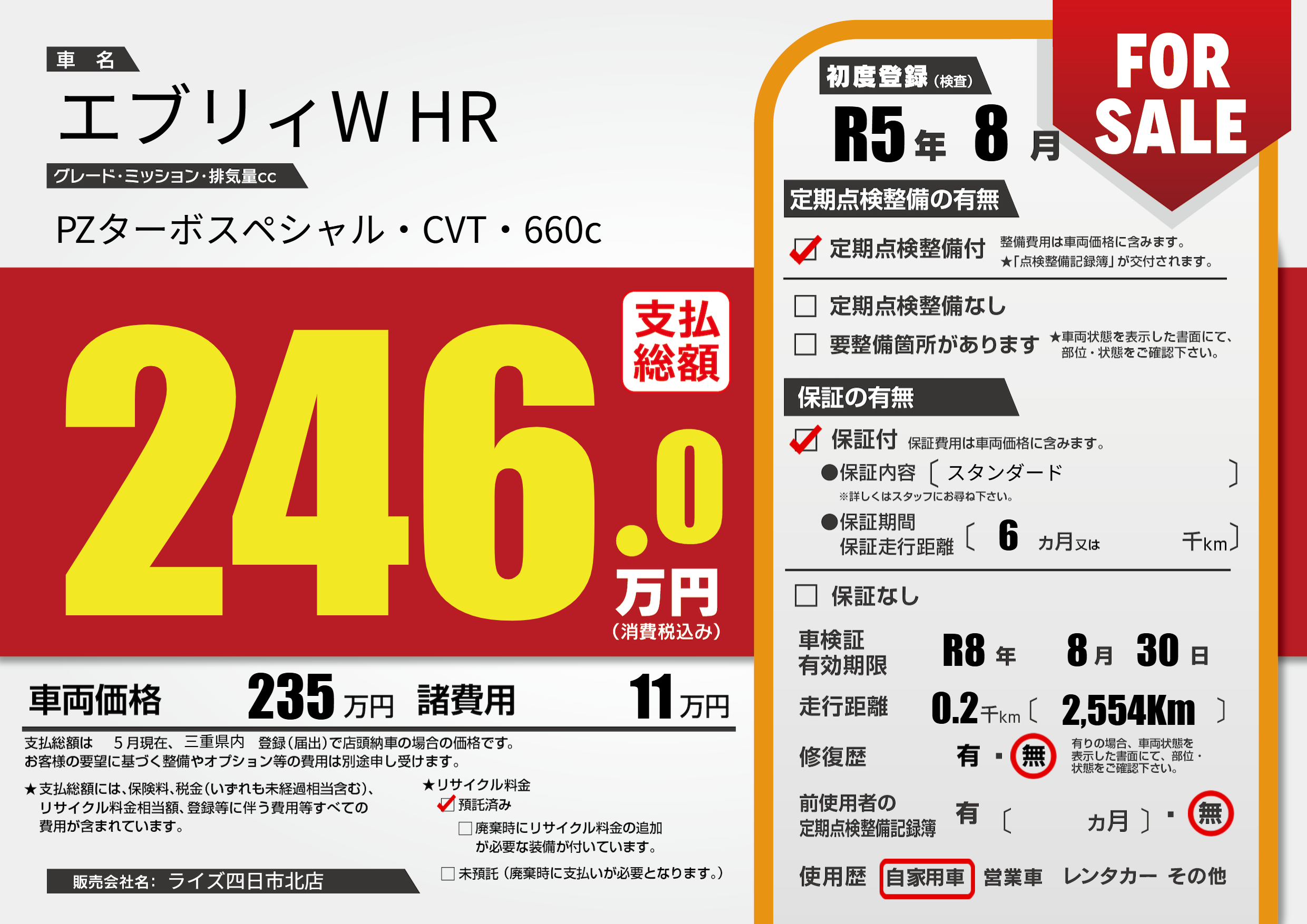 | 車名 | エブリィW HR | グレード ミッション 排気量 |