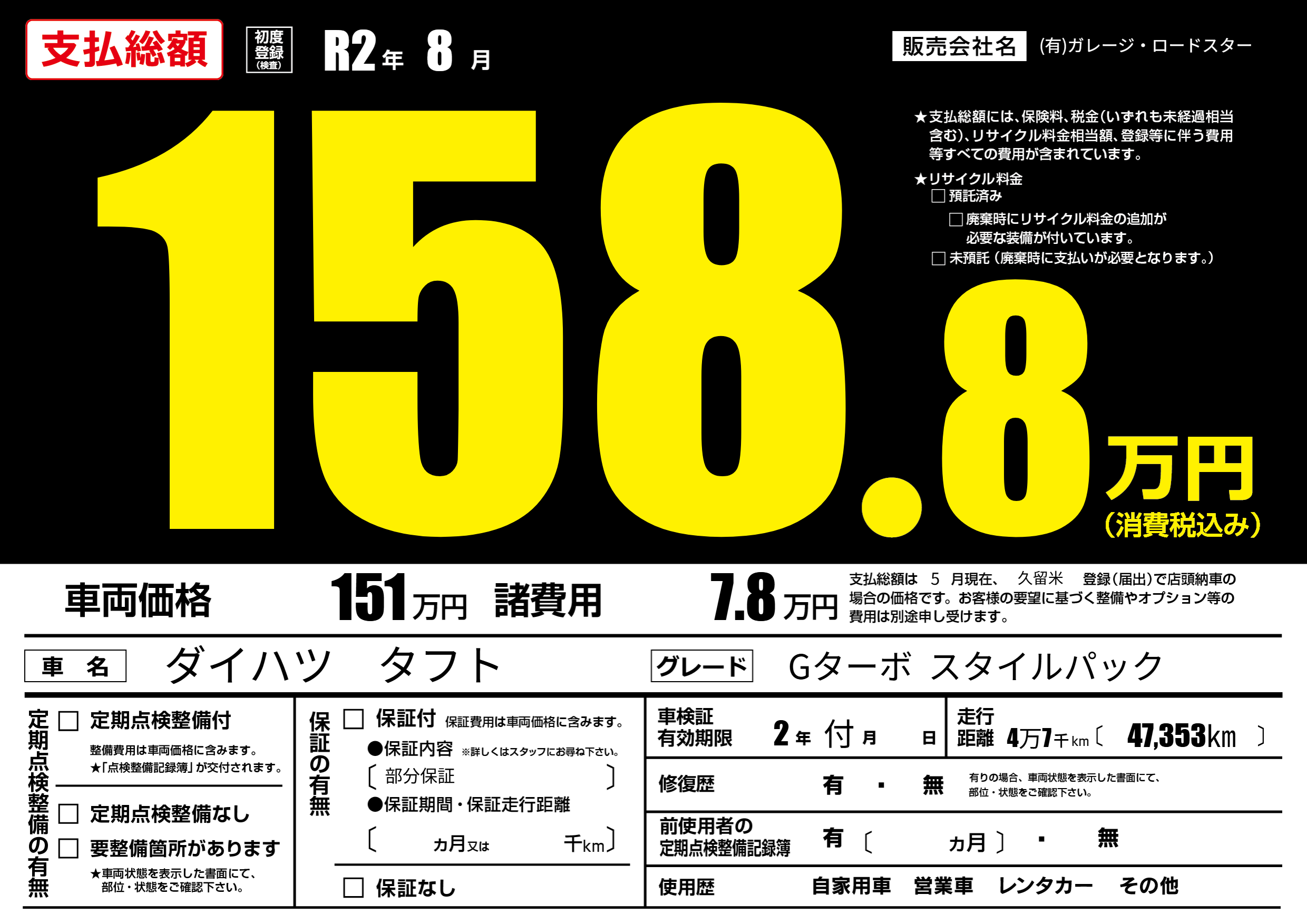 | 走行キロ | 0.4万km | 初年度登録 | R2年8月 |