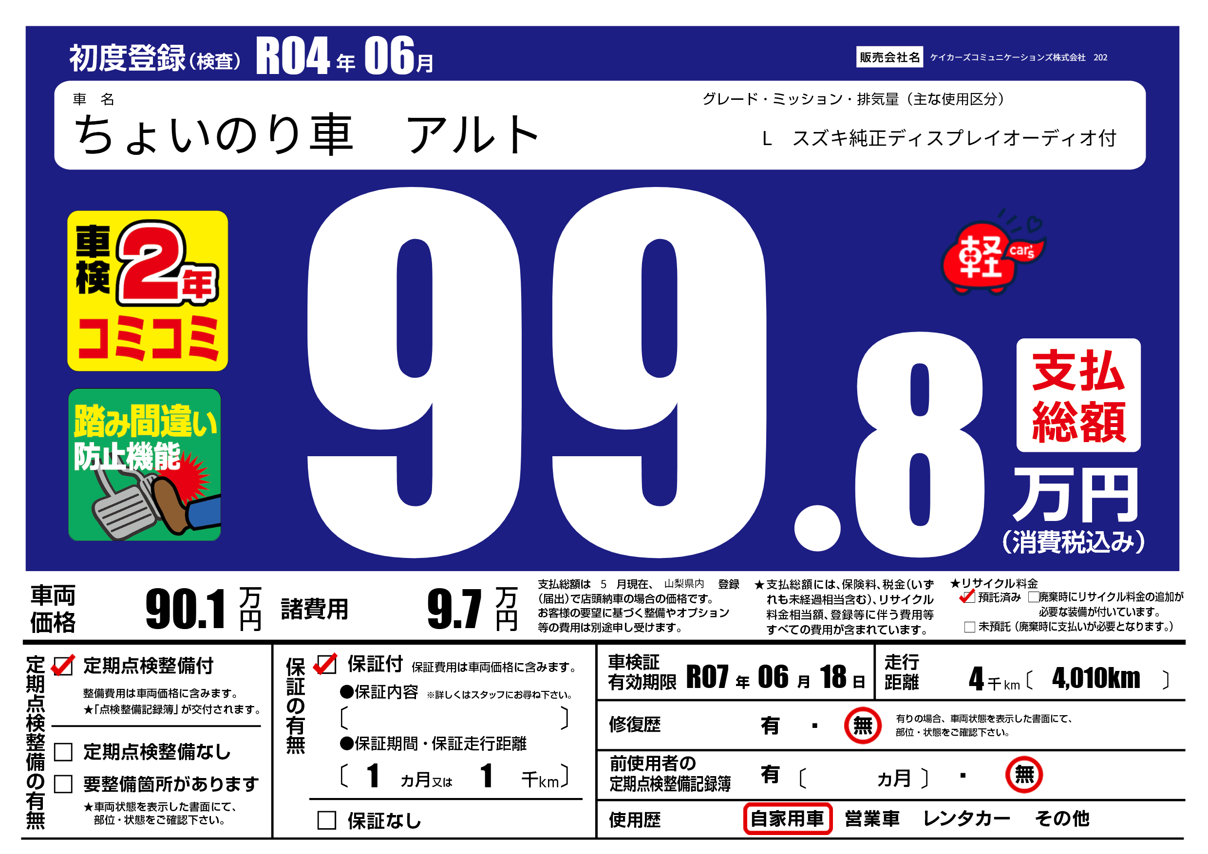 | 車名 | ちょいのり車 アルト | グレード ミッション 排気量 |