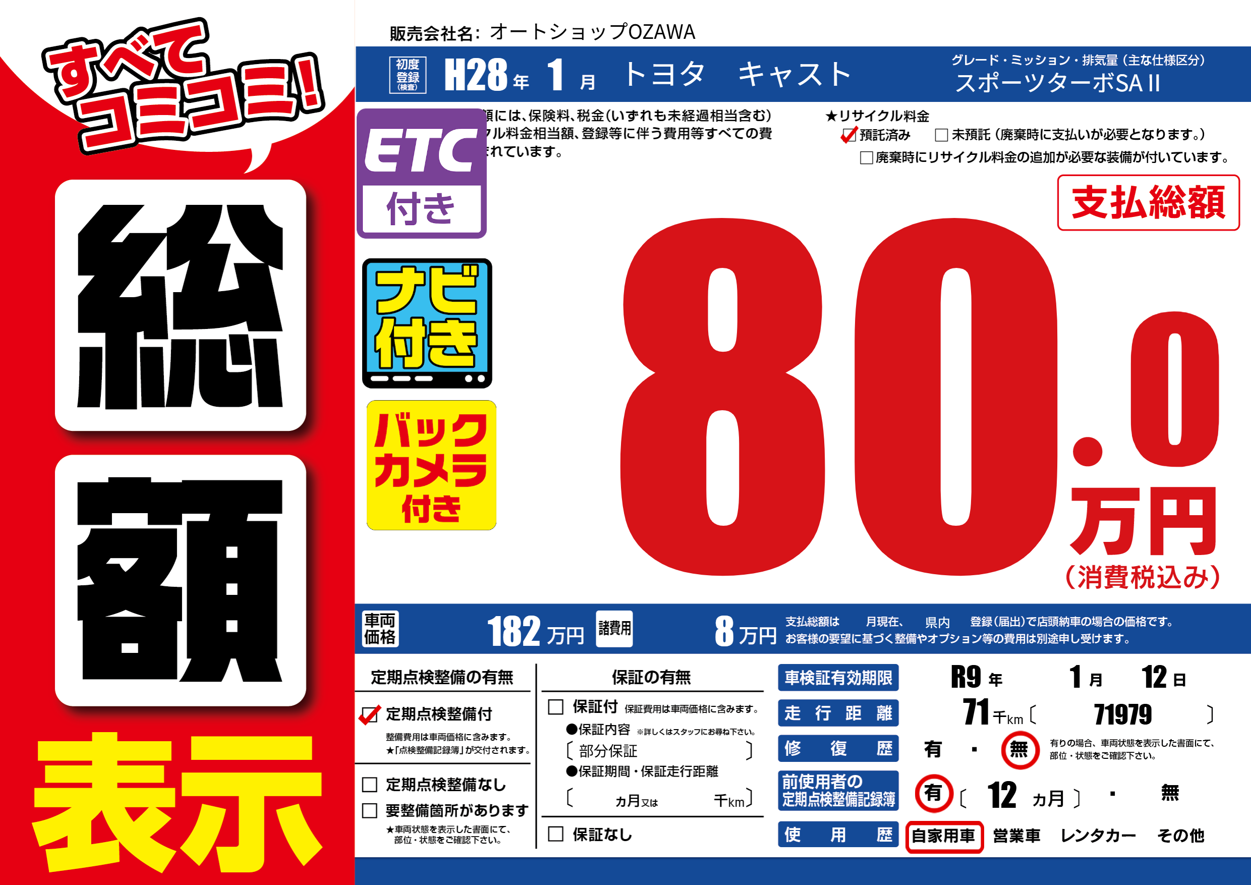 | 車検制限 | R9年 1月 12日 | ||