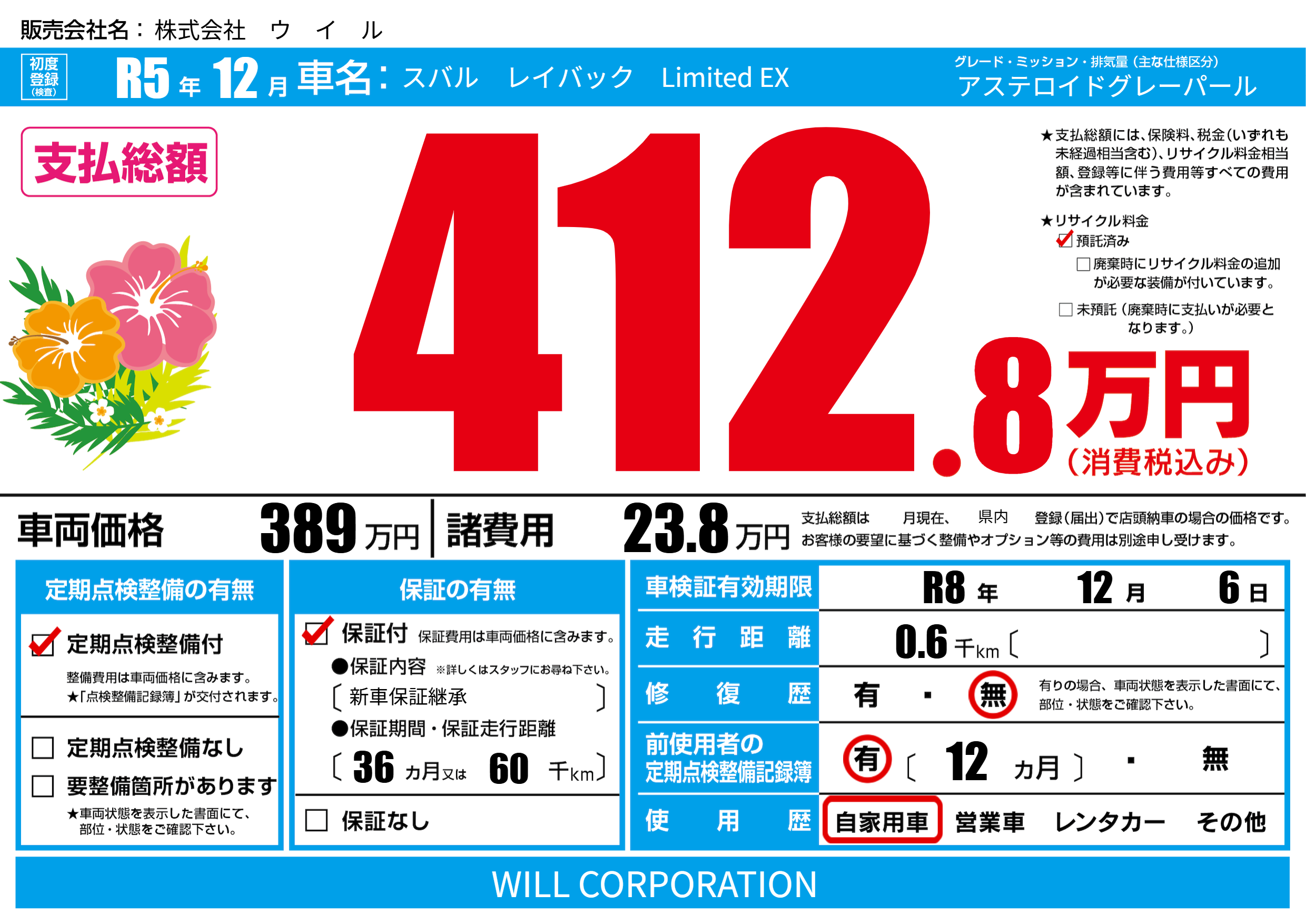| 車名 | スバル レイバック Limited EX | グレード ミッション 排気量 |