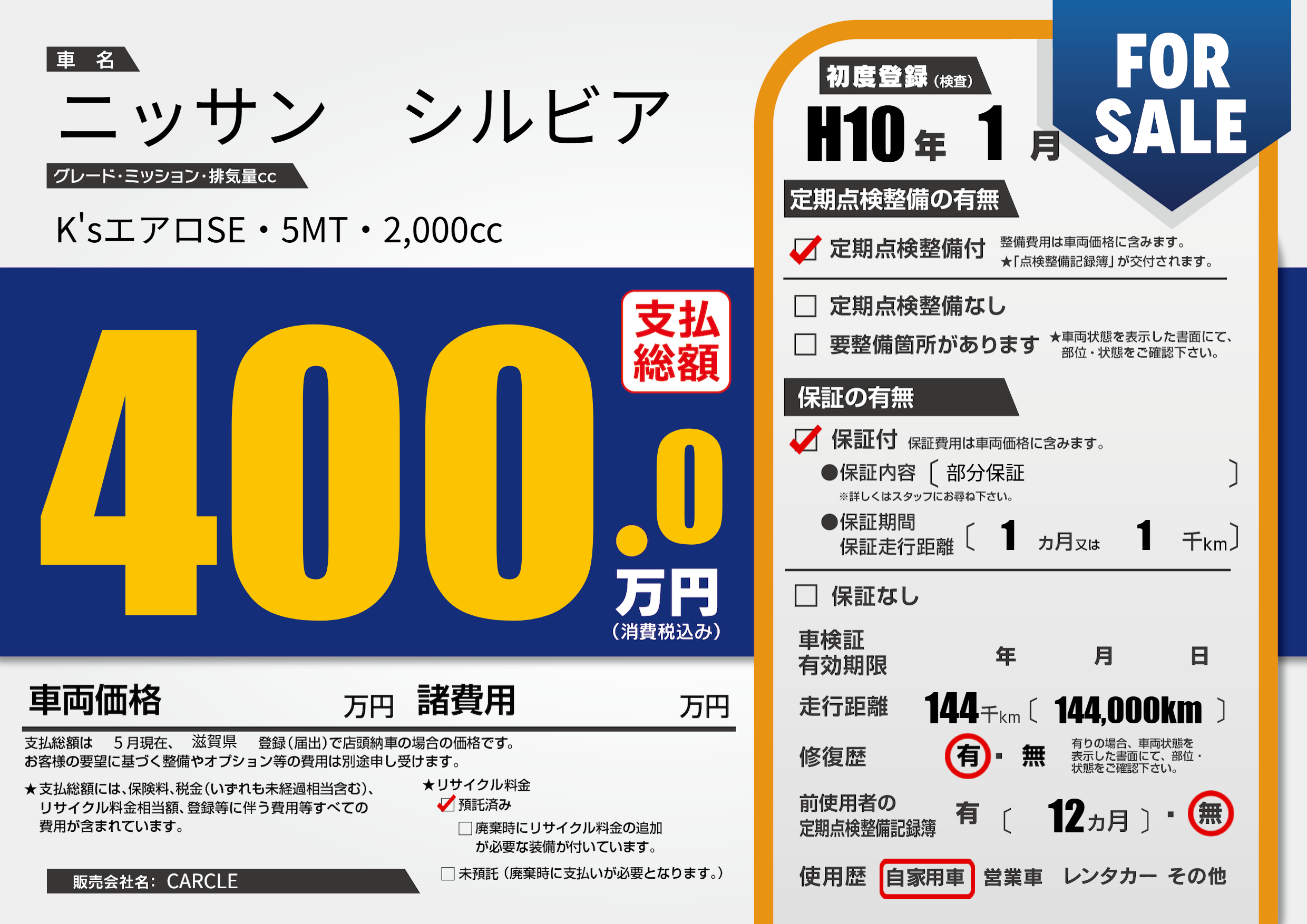 | 車名 | ニッサン シルビア | グレード ミッション 排気量 |