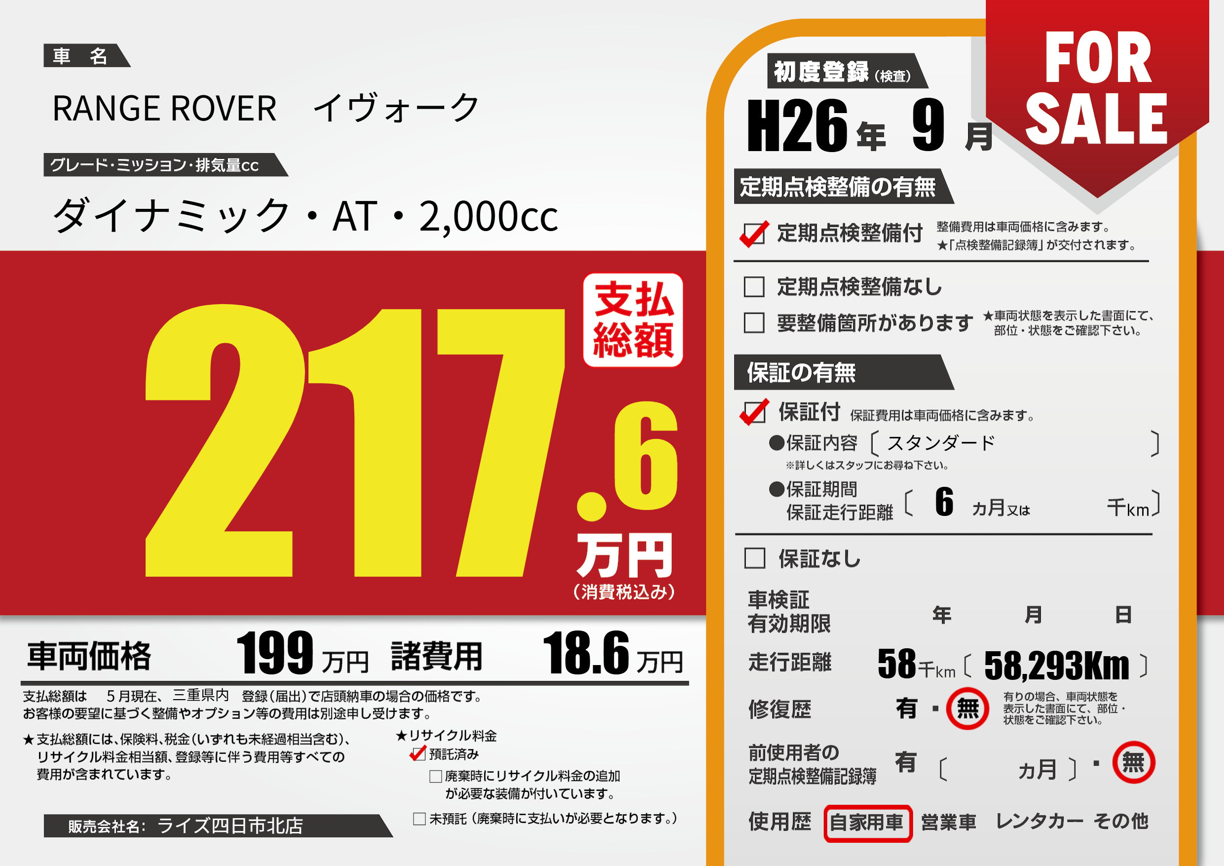 | 車名 | RANGE ROVER イヴォーク | グレード ミッション 排気量 |
