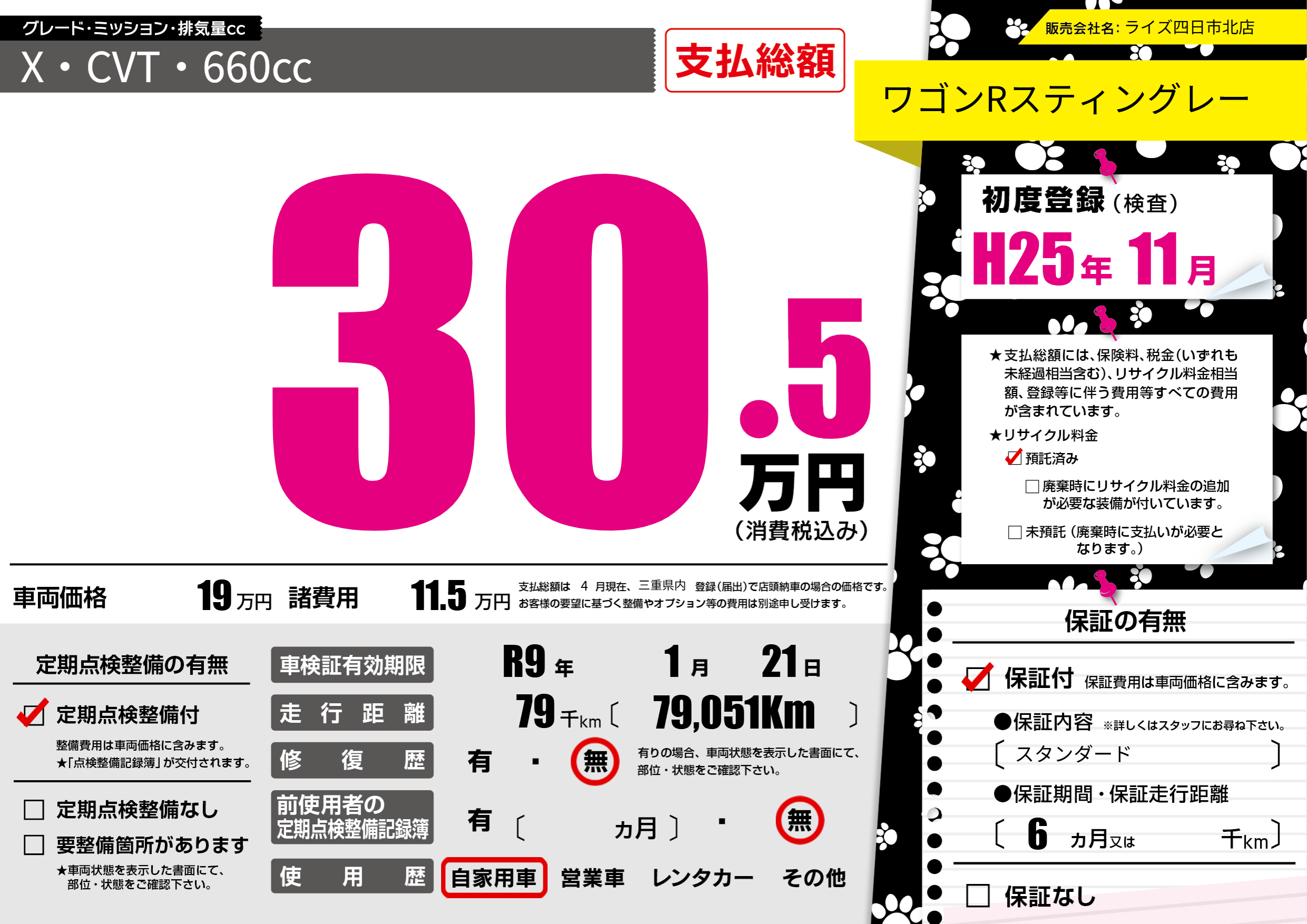 | 走行キロ | 7.9万km | 初年度登録 | H25年11月 |