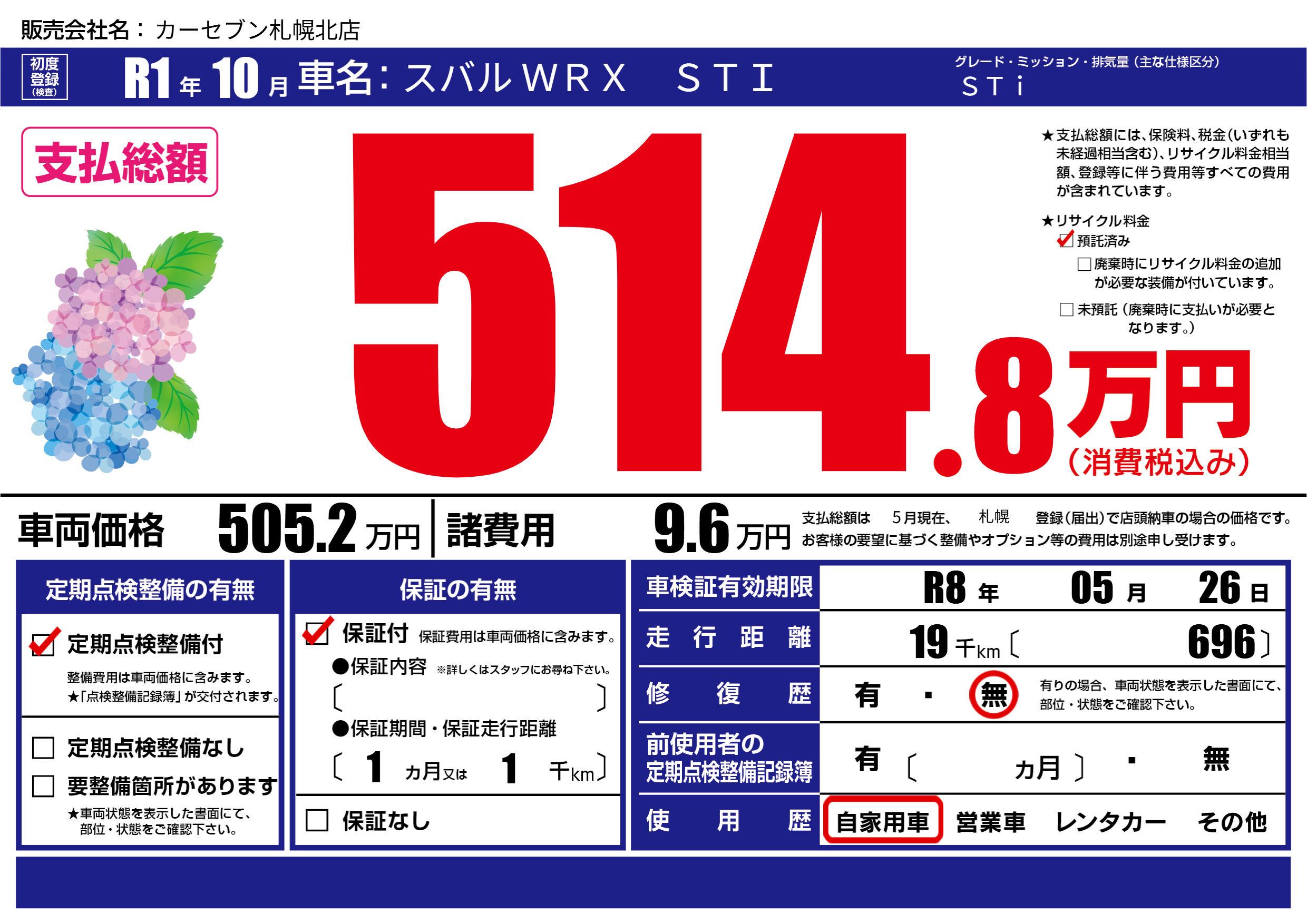 | 車名 | スバル WRX STI | グレード ミッション 排気量 |