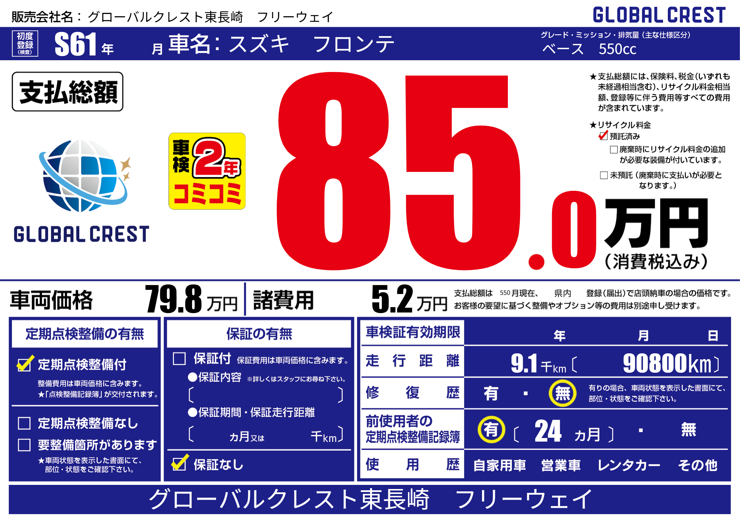 | 車名 | スズキ フロンテ | グレード ミッション 排気量 |