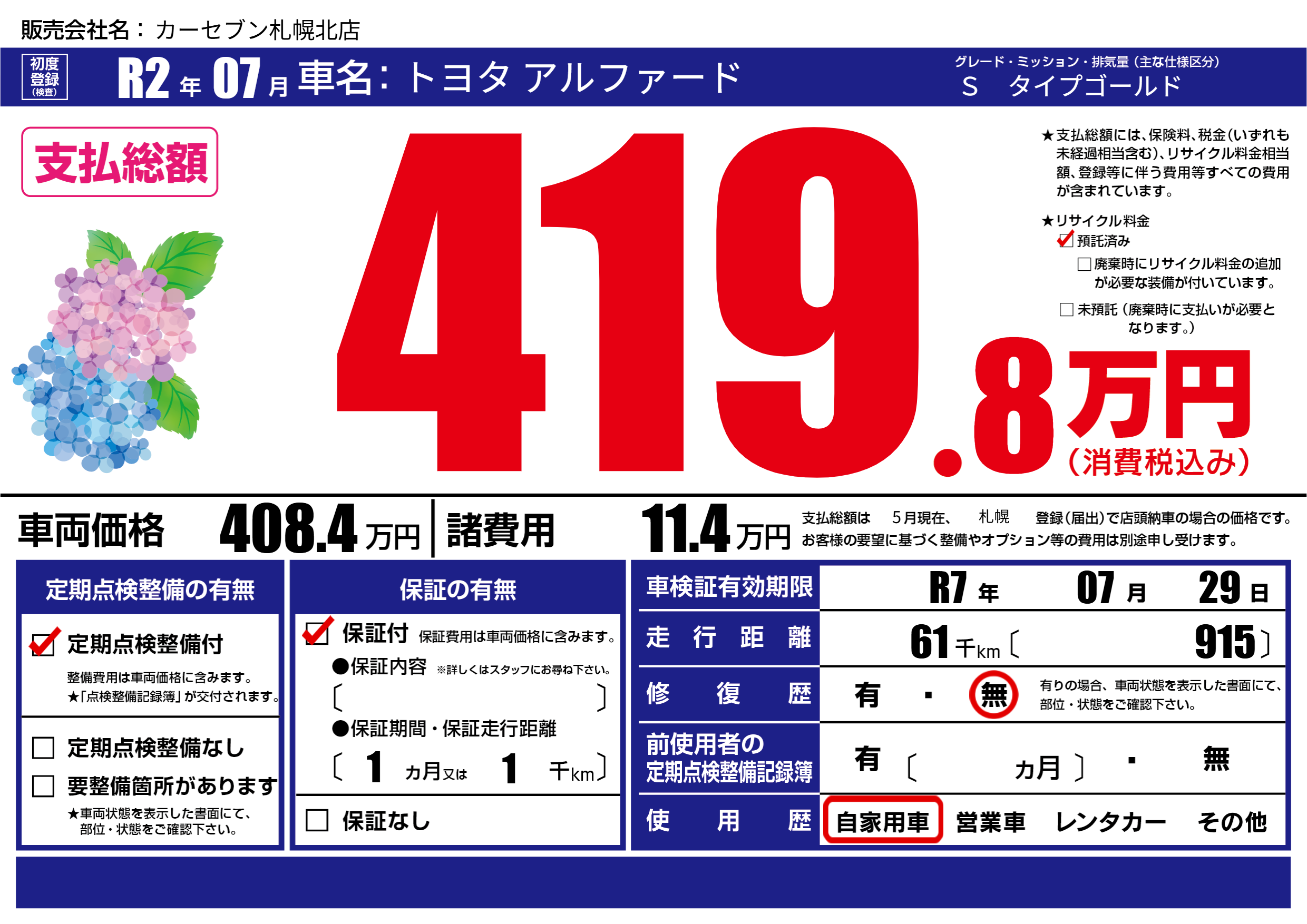 | 車名 | トヨタ アルファード | グレード ミッション 排気量 |