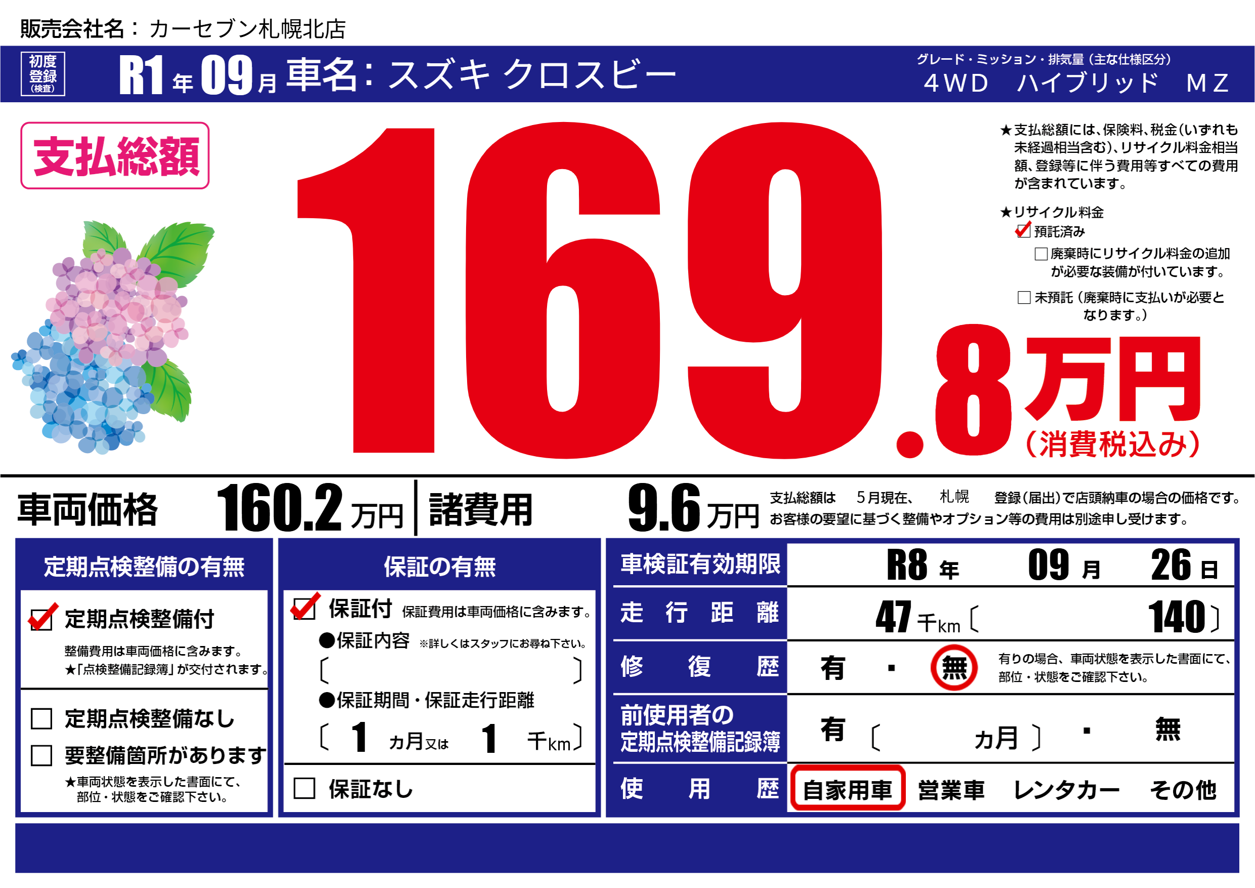 保証付き 保証内容(---) 1ヶ月または(1)千kmまで |