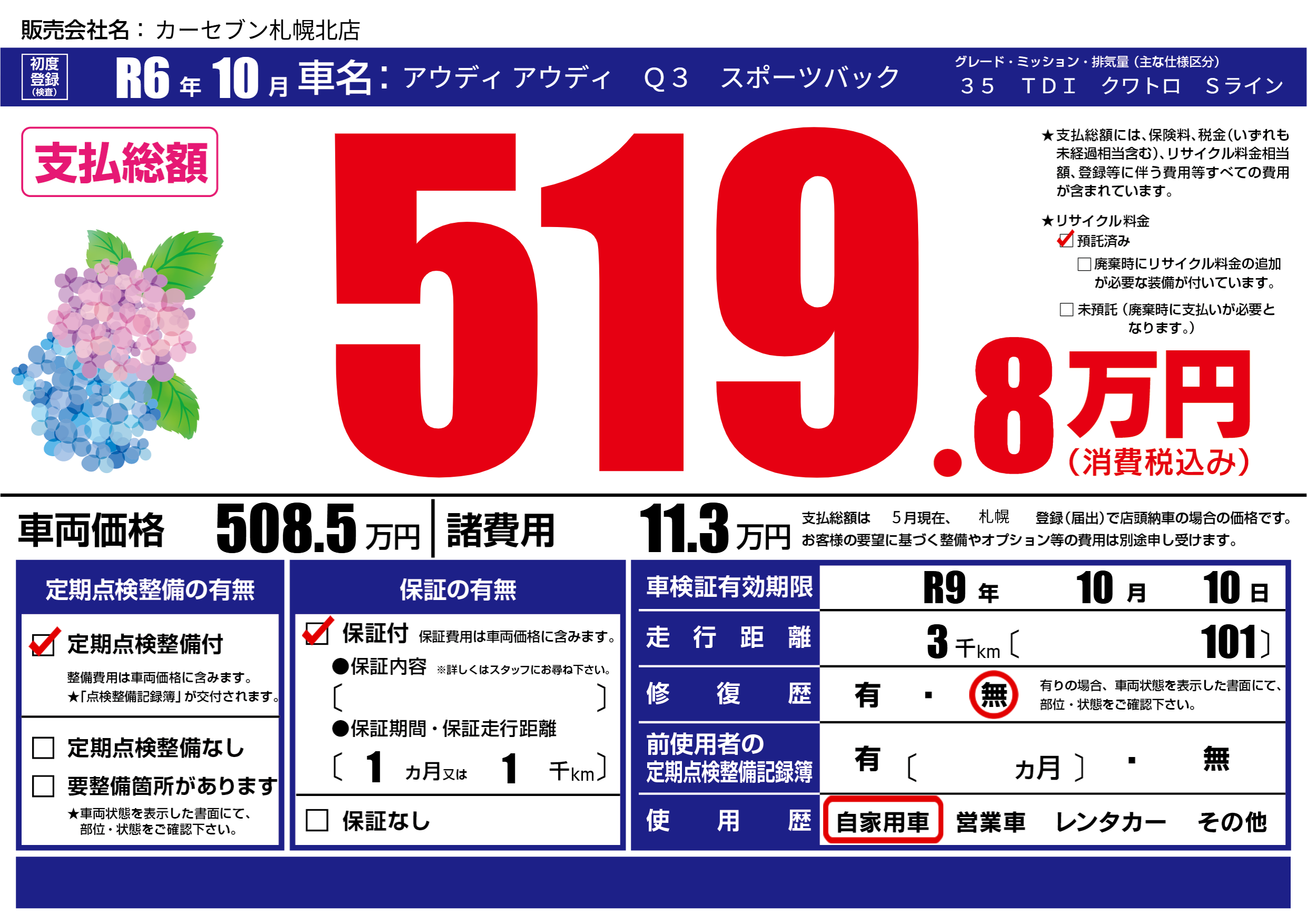 | 走行キロ | 0.3万km | 初年度登録 | R6年10月 |