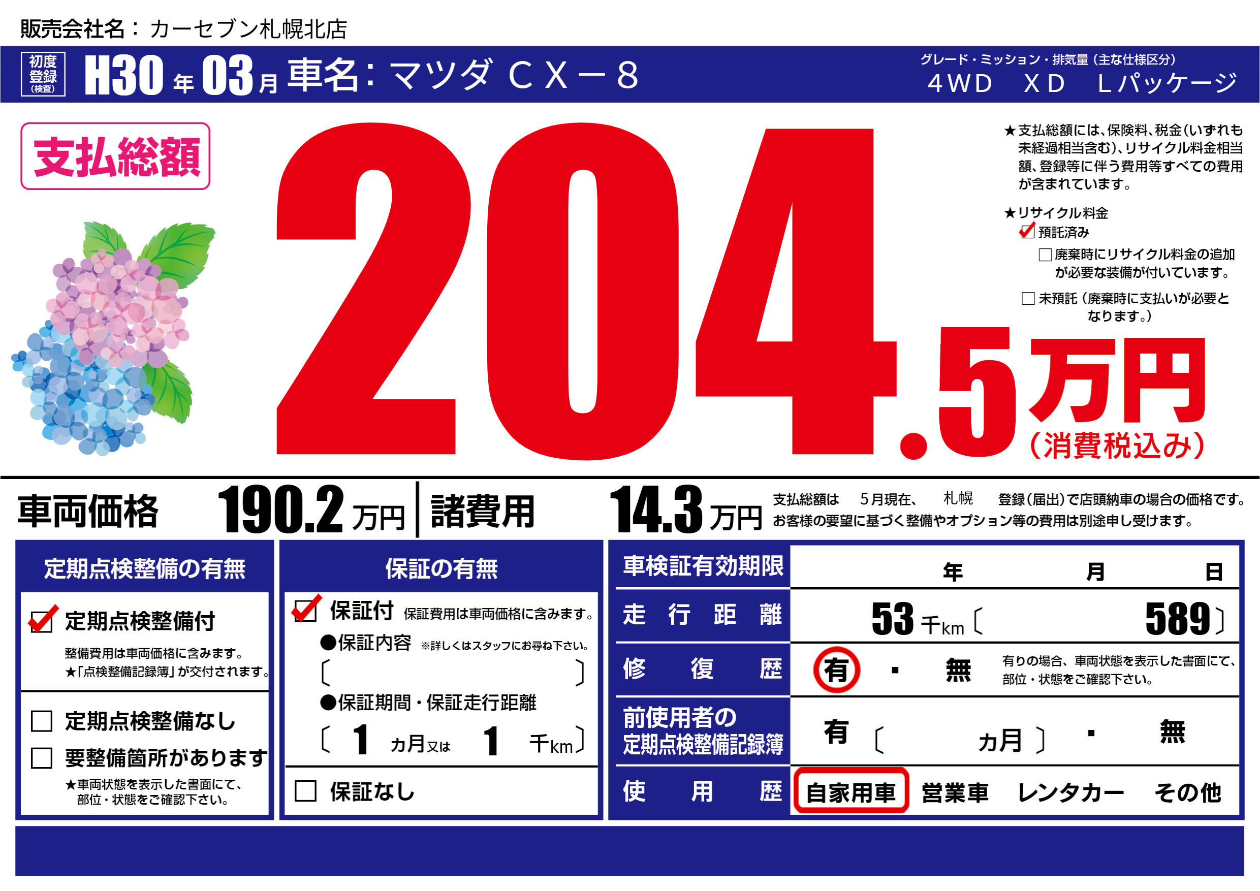 | 車名 | マツダ CX-8 | グレード ミッション 排気量 |