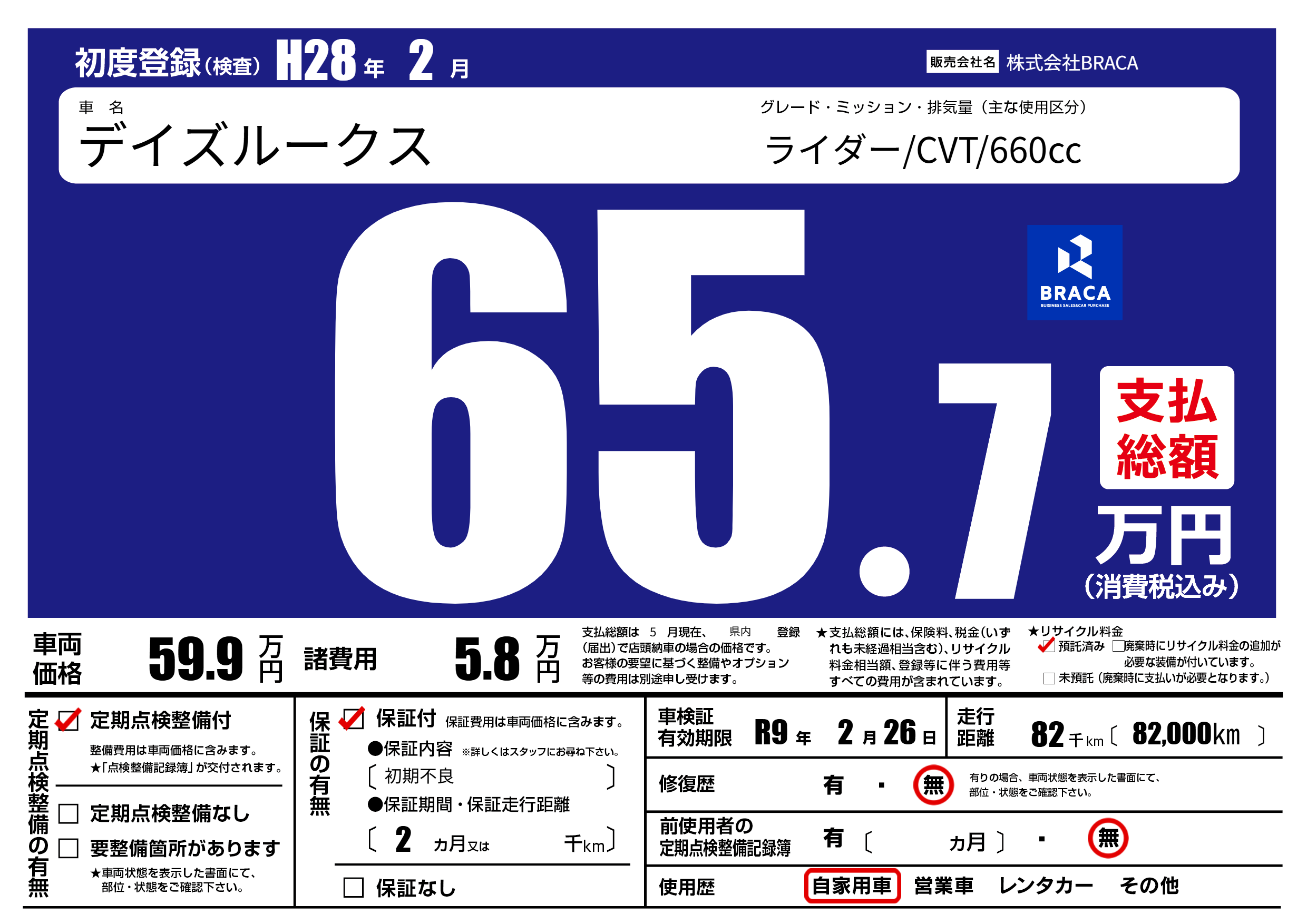 | 走行キロ | 8.2万km | 初年度登録 | H28年2月 |