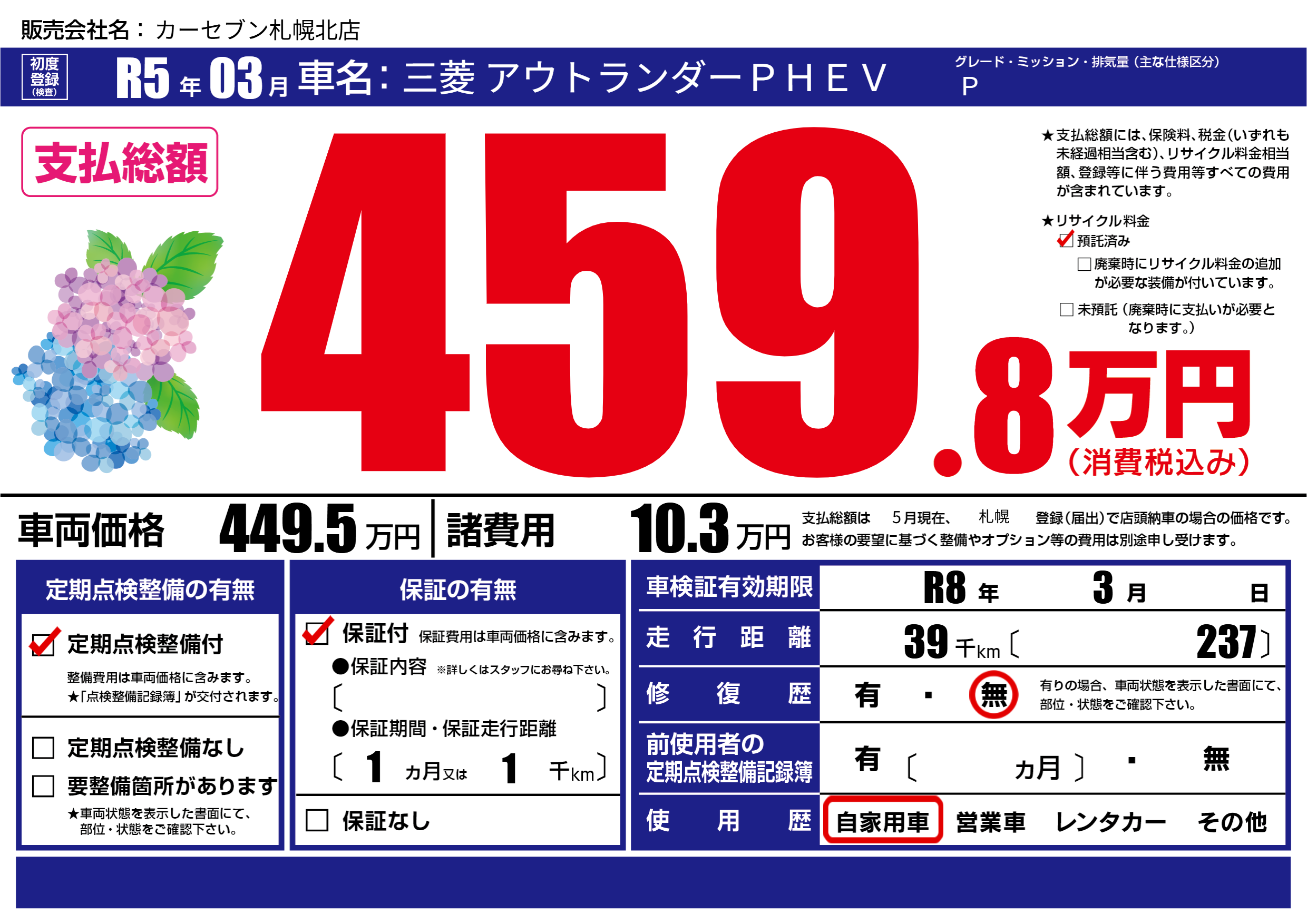 | 走行キロ | 3.9万km | 初年度登録 | R5年03月 |