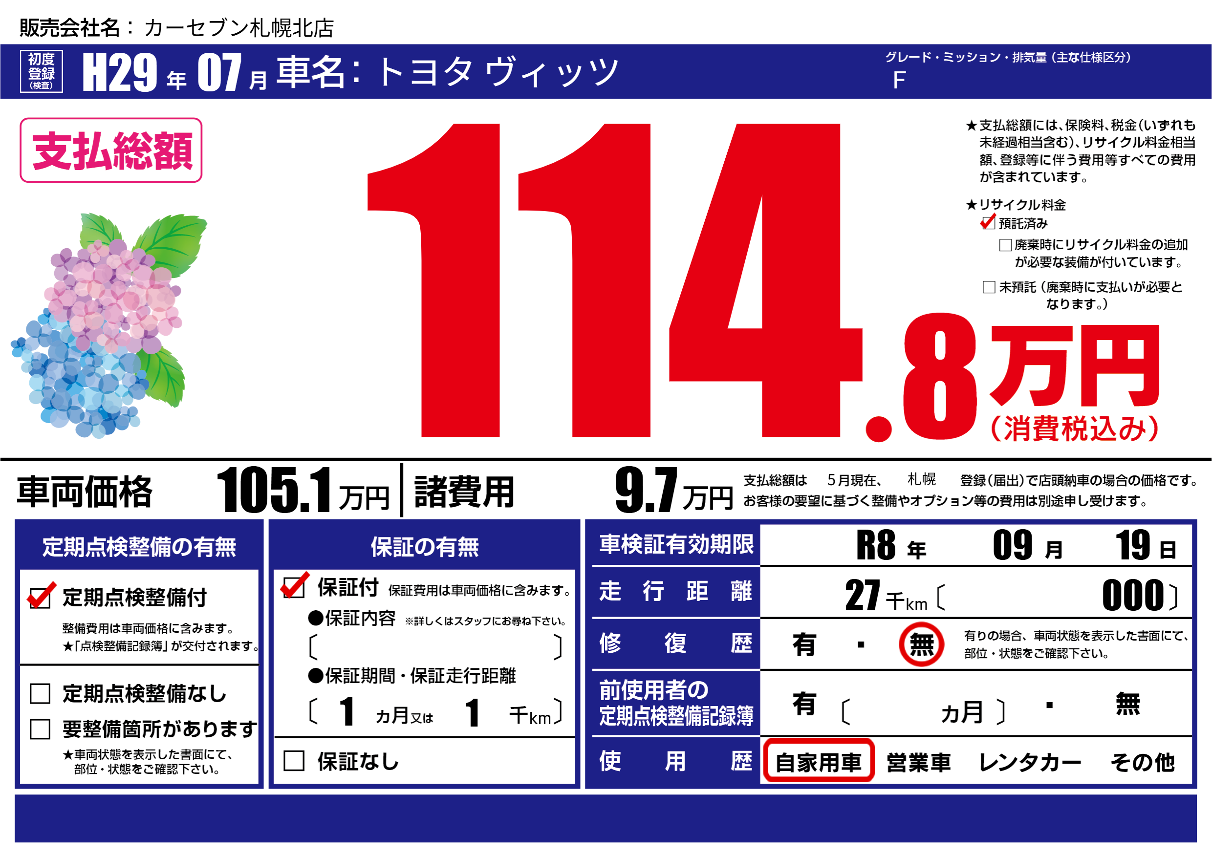| 走行キロ | 2.7万km | 初年度登録 | H29年07月 |