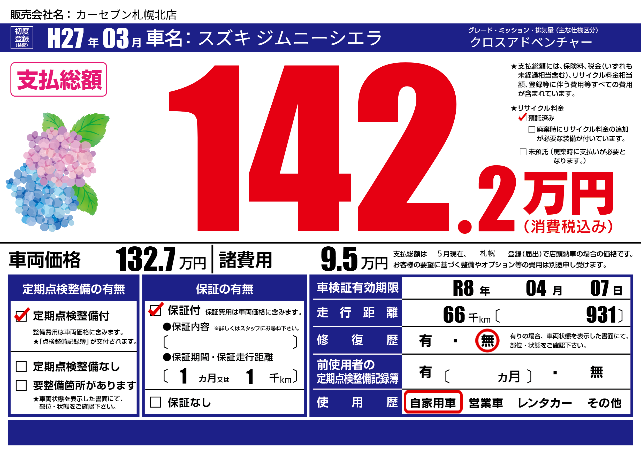 | 走行キロ | 6.6万km | 初年度登録 | H27年03月 |