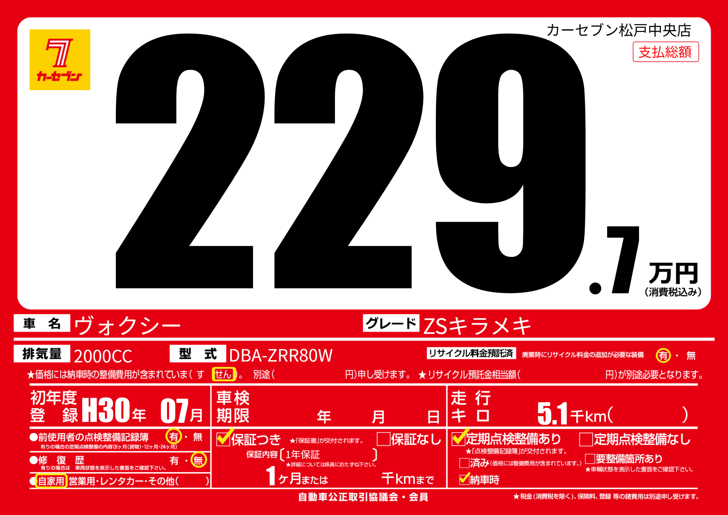 | 走行キロ | 0.5万km | 初年度登録 | H30年07月 |