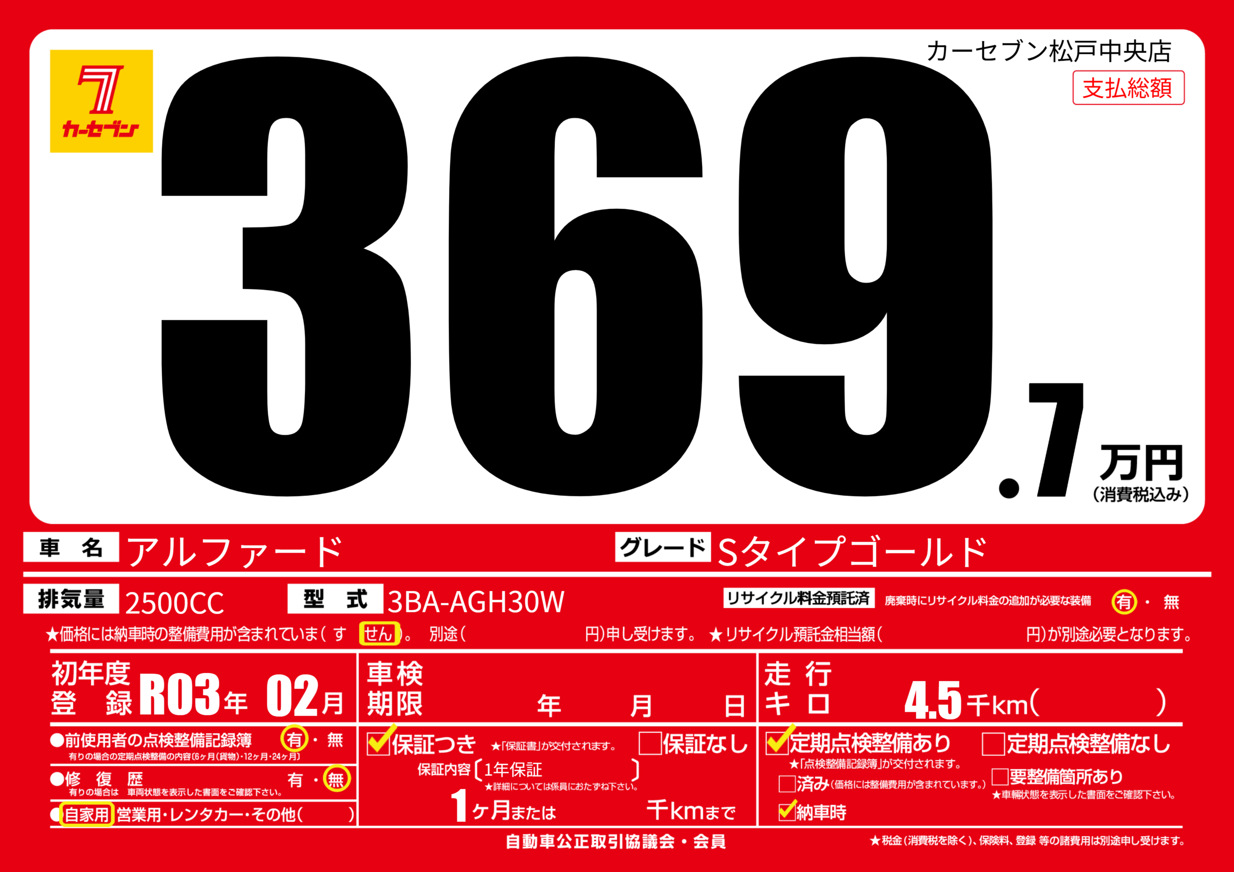 | 車名 | アルファード | グレード ミッション 排気量 |