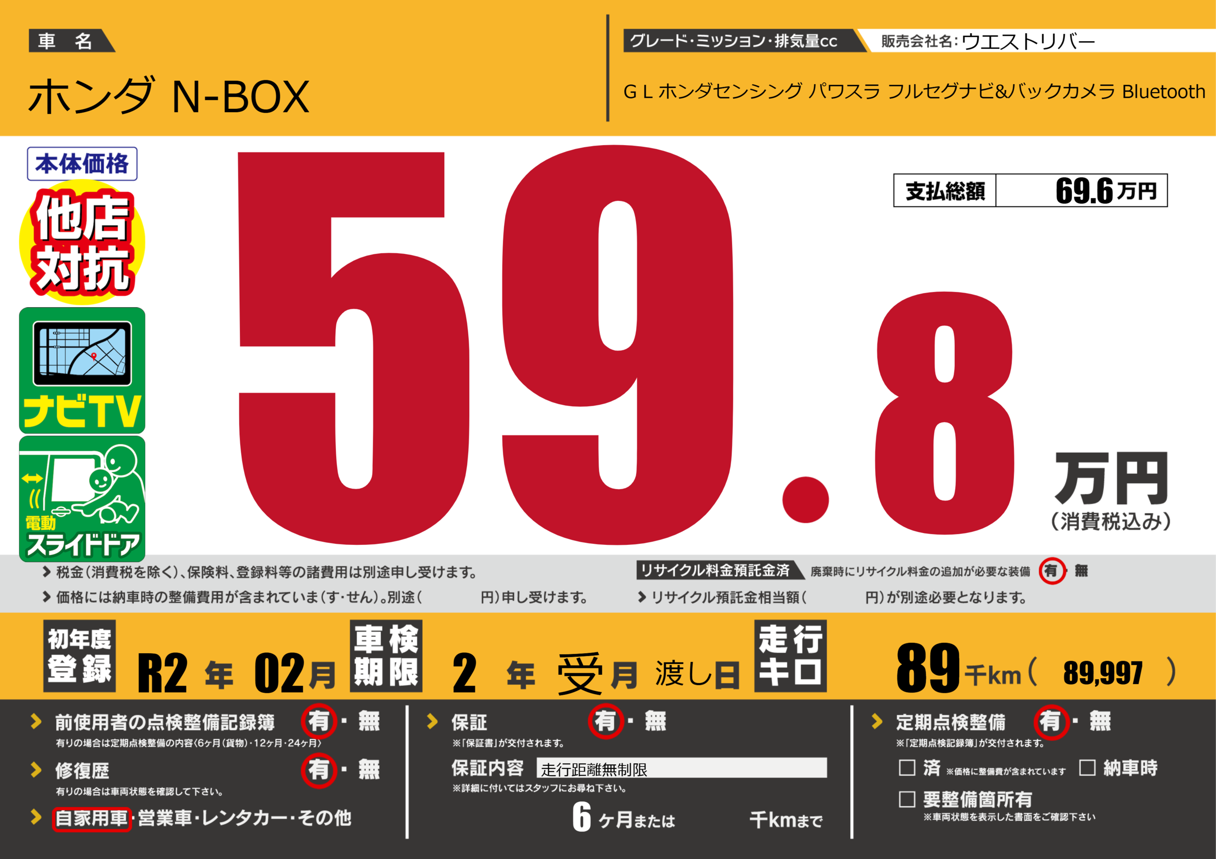 | 車名 | ホンダ N-BOX | グレード ミッション 排気量 |