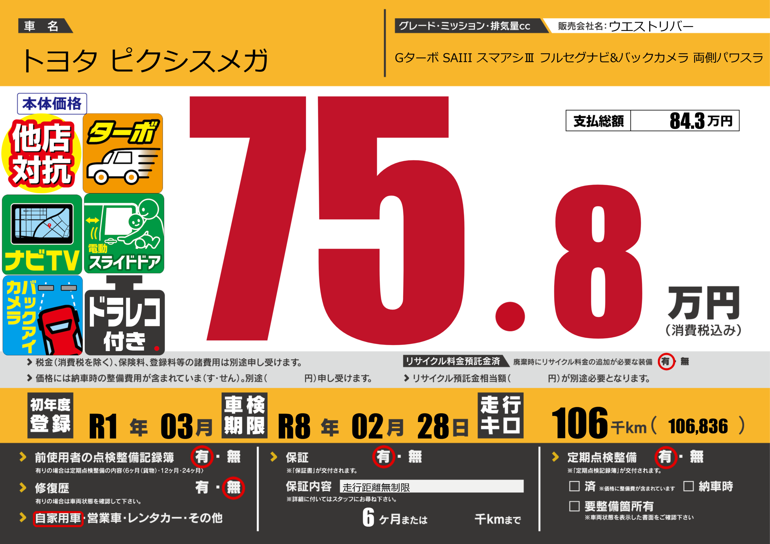 | 走行キロ | 10.6万km | 初年度登録 | R1年03月 |