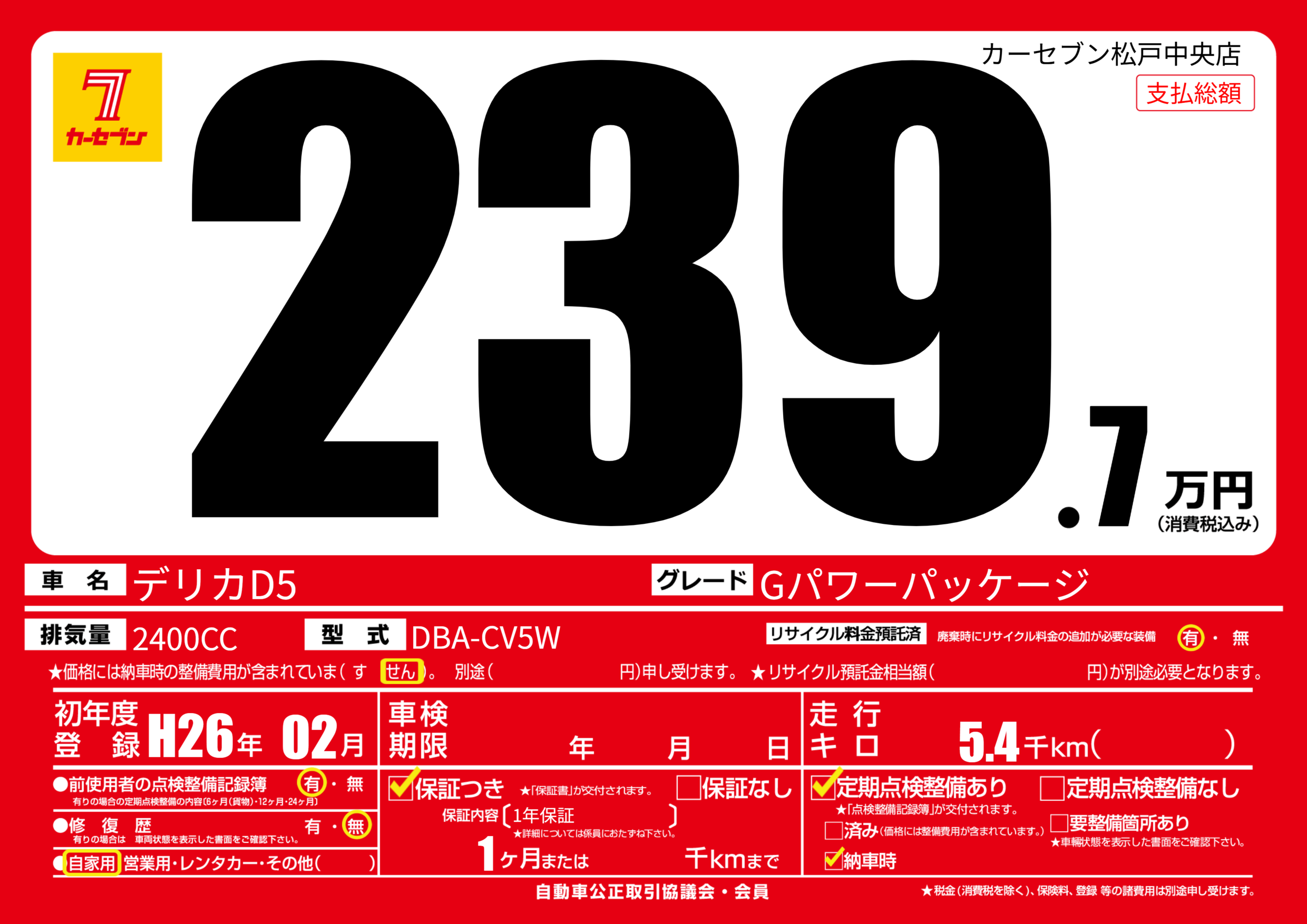 | 車名 | デリカD5 | グレード ミッション 排気量 |